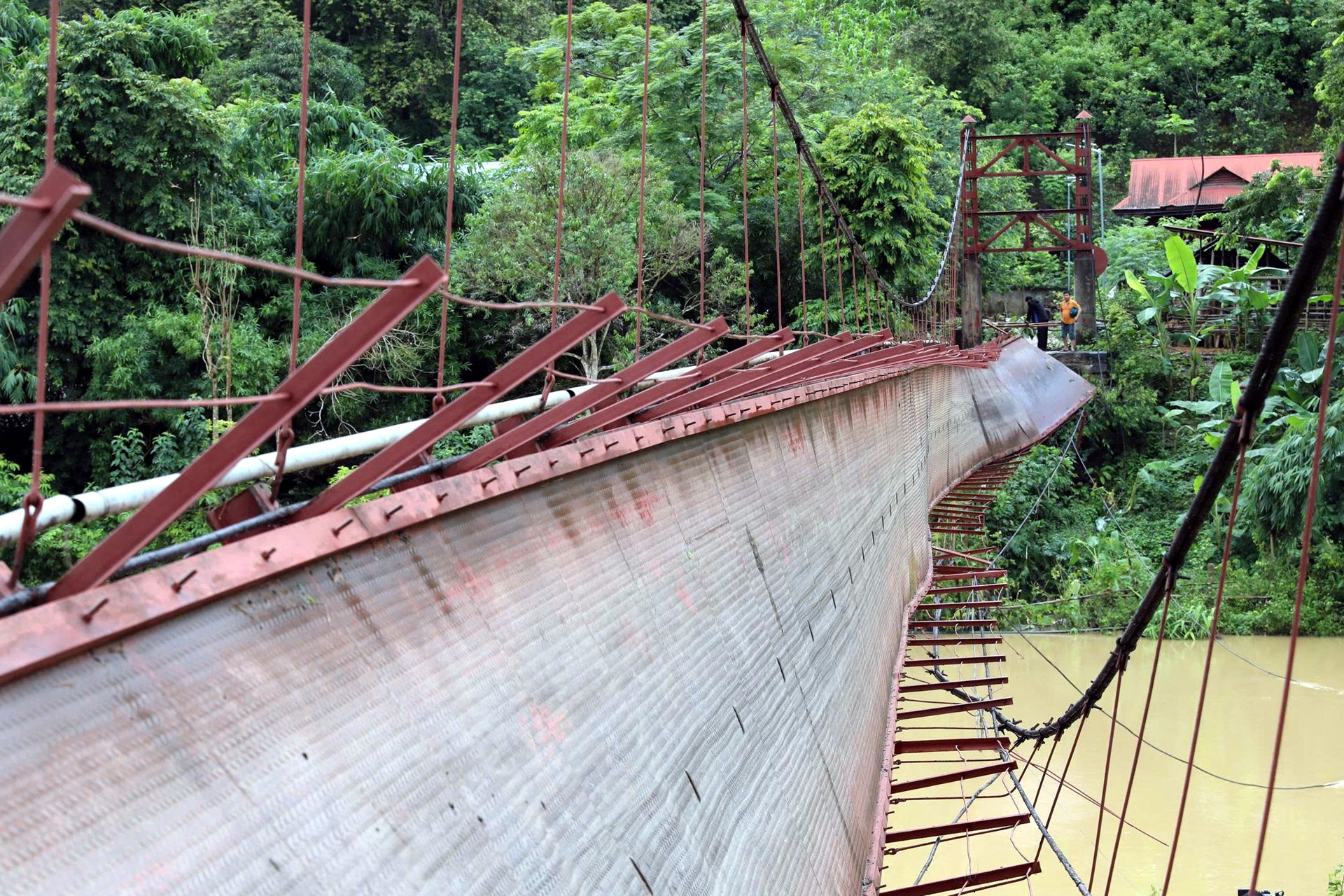 Sau vụ đứt cáp, cầu treo Pa Thơm (xã Thanh Yên, tỉnh Điện Biên) nghiêng hẳn sang một biên, lực lượng chức năng đã phong tỏa hiện trường không cho các phương tiện qua lại.