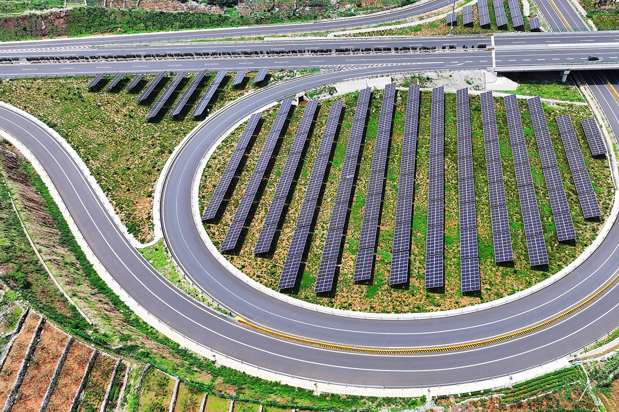 Cùng với sự bùng nổ của xe điện, các cao tốc của Trung Quốc cũng đang trong quá trình chuyển đổi xanh. Các tấm pin điện mặt trời phủ kín sườn dốc và mái các công trình phụ trợ nằm hai bên đường.