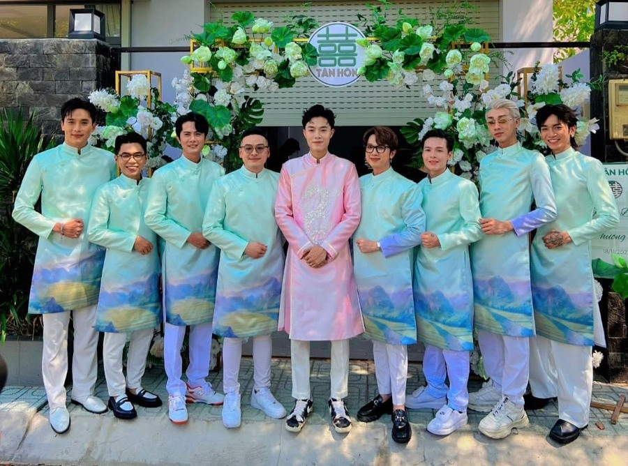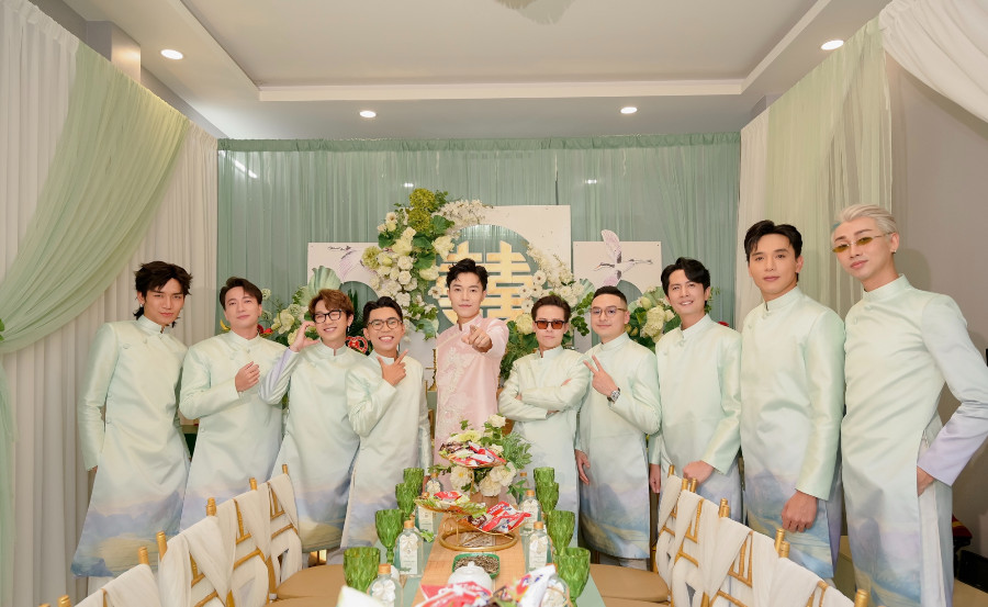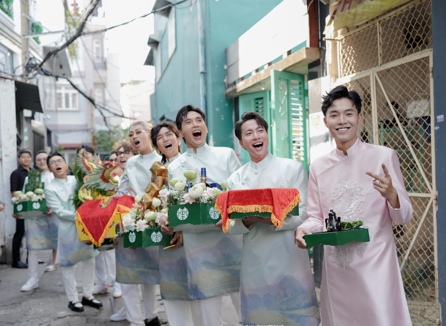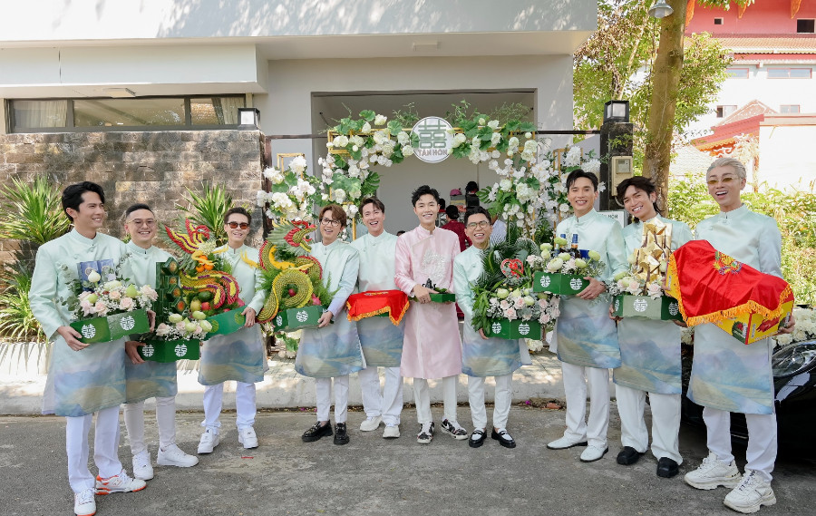 Đội hình bê tráp nhà trai có sự góp mặt của các nghệ sĩ: S.T Sơn Thạch, Huỳnh Phương, Minh Dự, Thuận Nguyễn, Minh Xù, BB Trần, Hải Triều... mang sính lễ đến rước cô dâu Phương Lan.