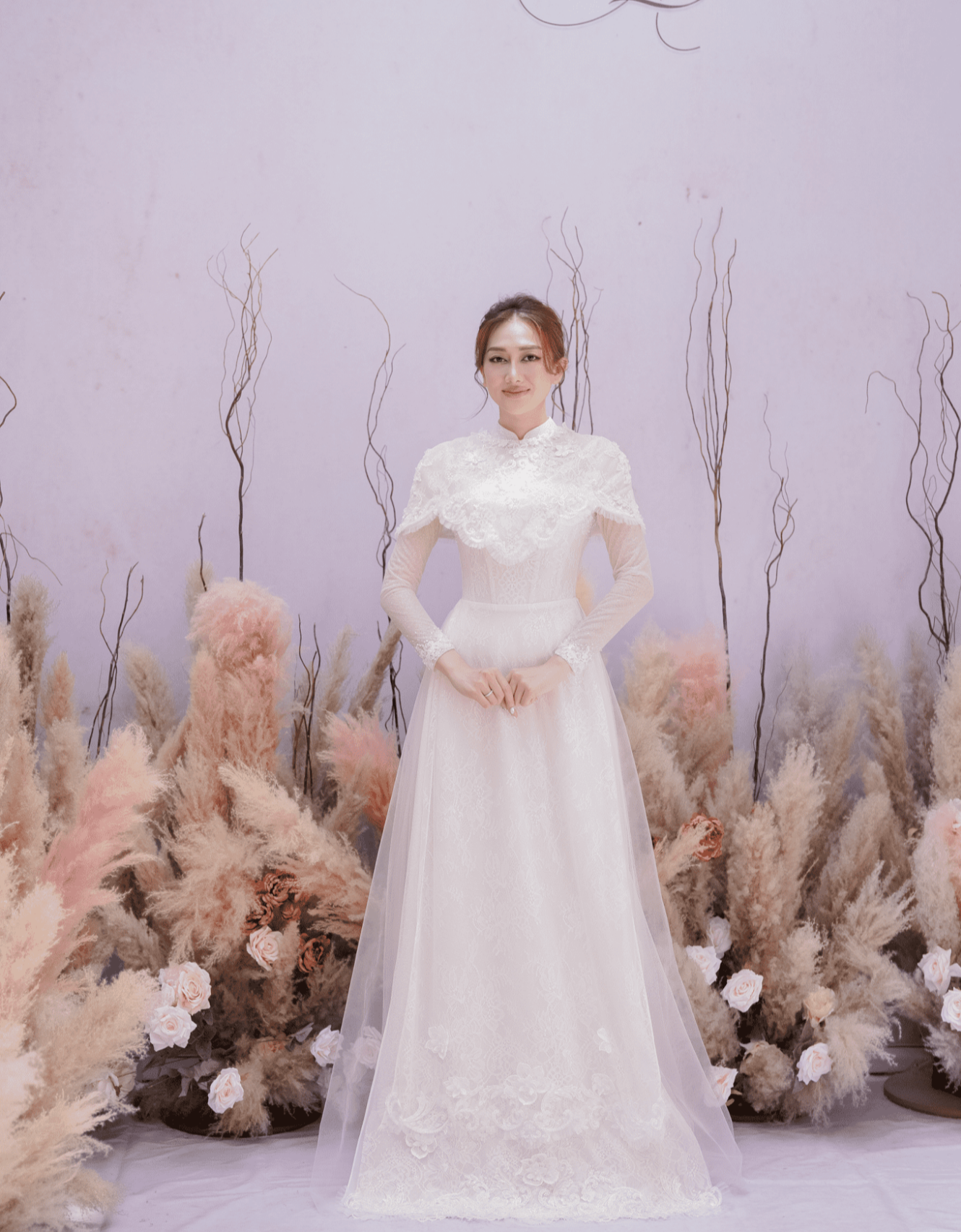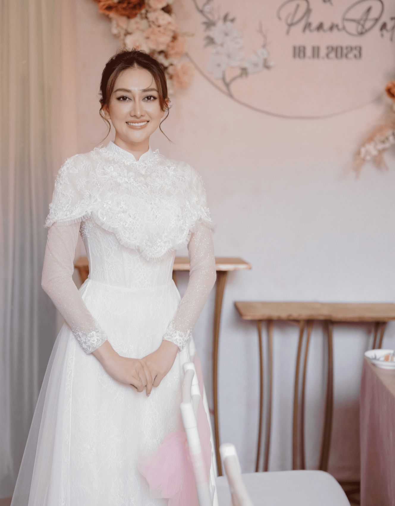 Cô dâu Phương Lan diện áo dài hồng nền nã, rạng rỡ trong lễ ăn hỏi. Phần áo choàng được đính kết, thêu tay tỉ mỉ, giúp tôn lên vẻ đẹp kín đáo cùng nhan sắc mặn mà của nữ diễn viên.