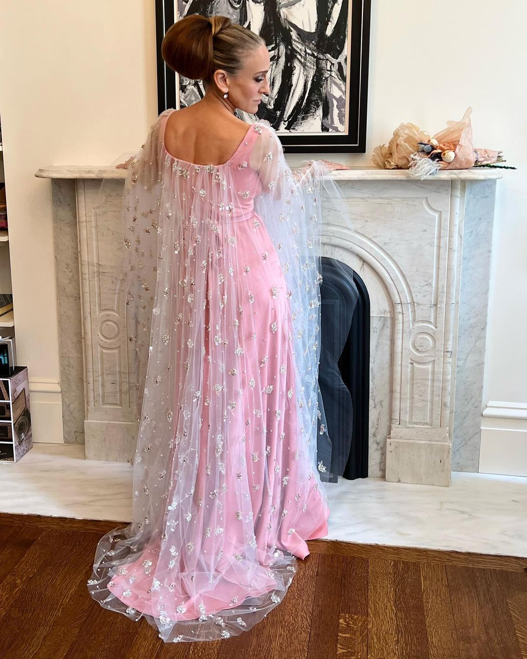 Sarah Jessica Parker vừa nổi bật vừa trẻ trung với đầm hồng tím phối với dép cao gót, túi xách cùng màu.