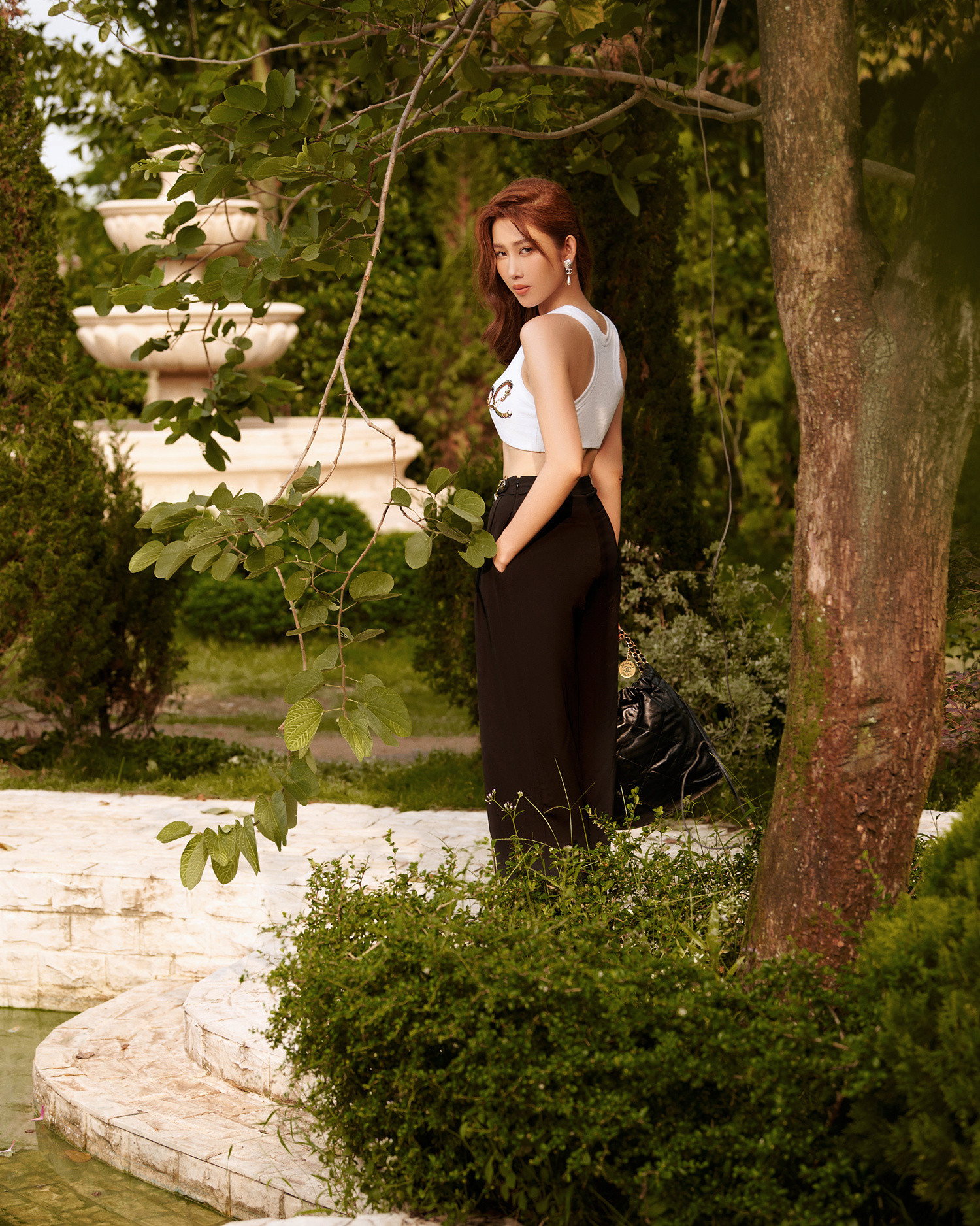 Phần lớn trang phục của Thúy Ngân diện có tông màu đơn giản, trung tính, họa tiết thời thượng đến từ nhà mốt Chanel. Cô kết hợp phụ kiện đeo eo cùng các thiết kế túi dây xích nhỏ tạo điểm cho trang phục.