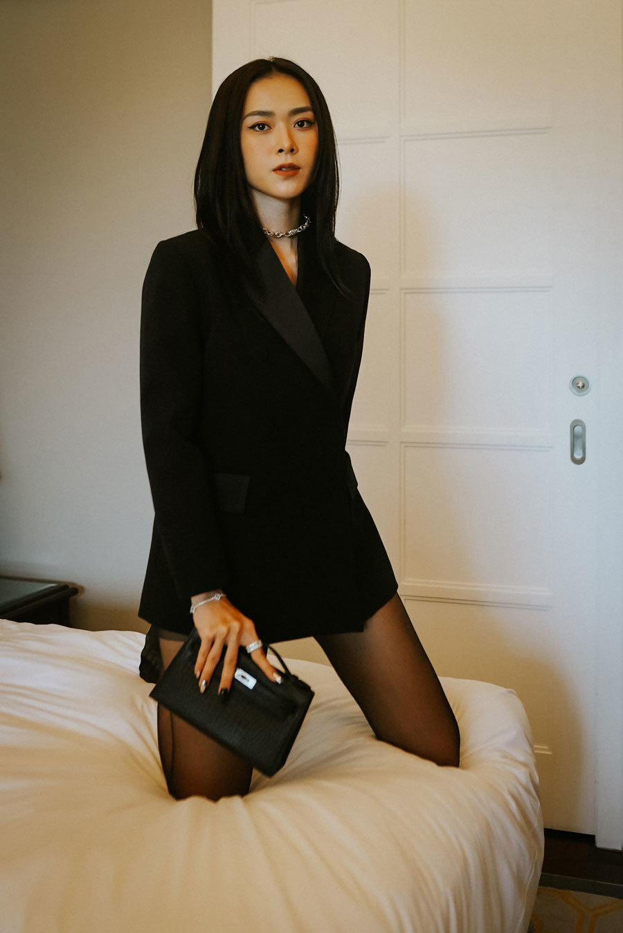 Nhân dịp này, nữ diễn viên thực hiện bộ ảnh khoe vóc dáng chuẩn và gợi cảm khi lăng xê vest và áo khoác măng tô cách điệu. Với phần áo trong, hotgirl đời đầu của Sài thành khi thì nóng bỏng với áo bra ren cúp ngực táo bạo, lúc lại khéo khoe vòng eo với áo lưới lót tạo sự uyển chuyển và thanh thoát cho các mẫu áo khoác bên ngoài.