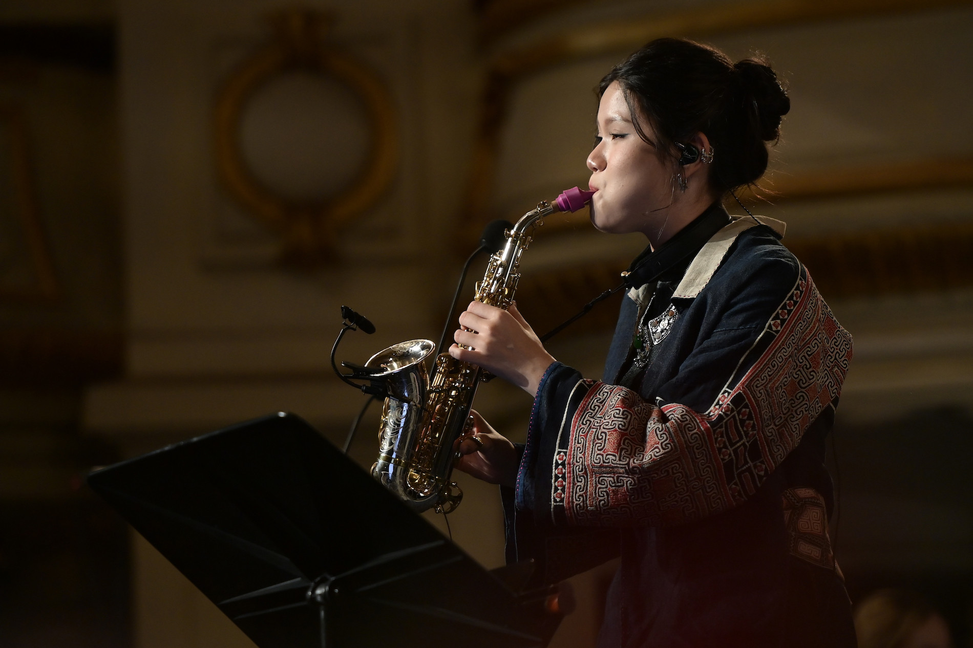Nếu như năm ngoái An Trần gây ấn tượng trên sân khấu với tà áo dài thì lần này nữ nghệ sĩ 19 tuổi chọn trang phục thổ cẩm cách điệu của nhà thiết kế Sỹ Hoàng ấn tượng và có màn trình diễn tác phẩm Tình ca Tây Bắc (nhạc: Bùi Đức Hạnh, phỏng thơ Cầm Giang) với tiếng kèn saxophone xuất sắc.