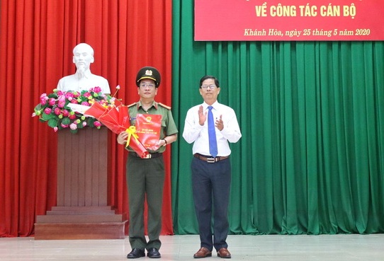 Chủ tịch UBND tỉnh Khánh Hòa Nguyễn Tấn Tuân trao quyết định và chúc mừng Đại tá Đào Xuân Lân. |