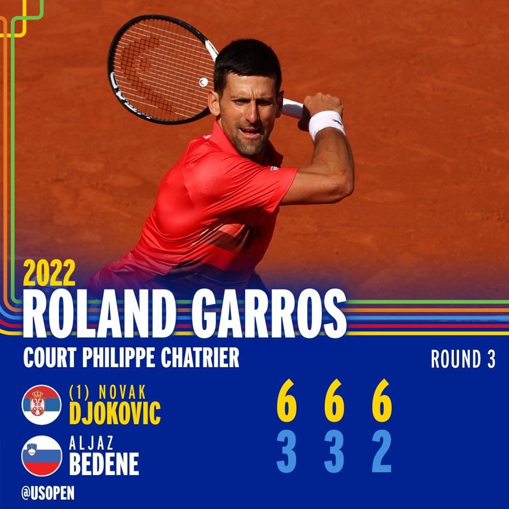 Novak Djokovic thắng nhanh Aljaz Bedene sau 3 set với điểm số 6-3, 6-3 và 6-2 để ghi tên mình vào vòng 4 Pháp mở rộng 2022.