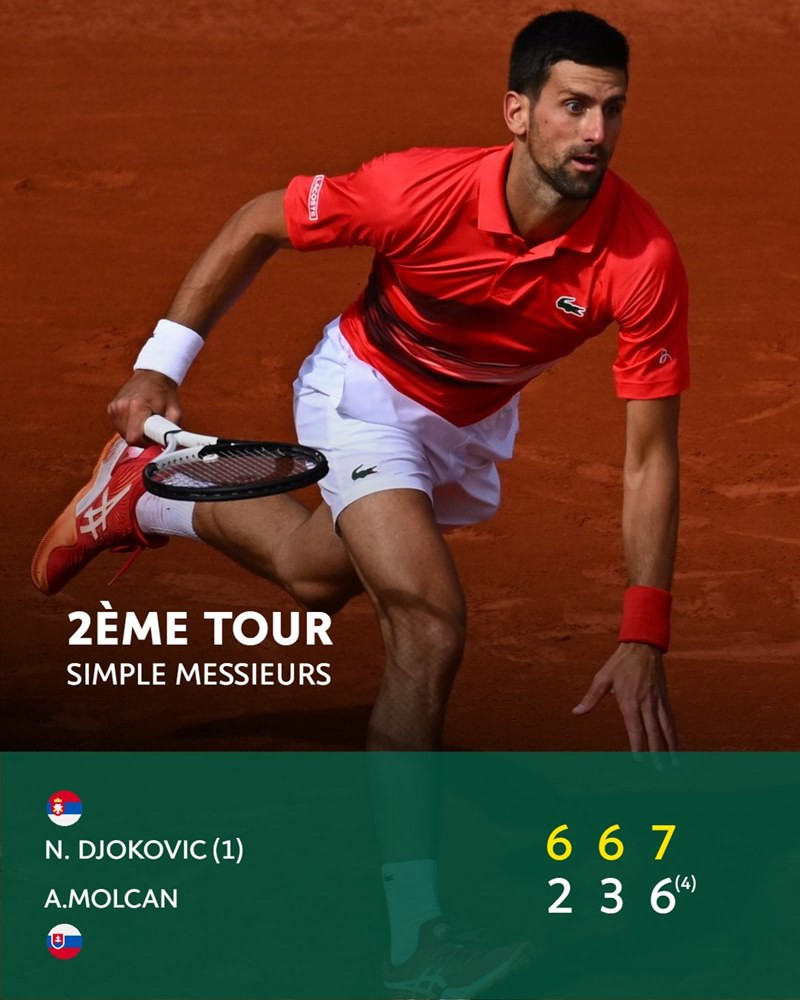 Djokovic khởi đầu vòng 2 với chiến thắng dễ dàng 6-2 ở set 1ĐKVĐ Roland Garros cũng không mất khó khăn để buộc Alex Molcan gác vợt với tỷ số 3-6 trogn set 2Molcan vùng lên mạnh mẽ trong set 3 và gây ra không ít khó khăn cho tay vợt số 1 thế giớiHai tay vợt thi đấu giằng co và set 3 phải bước vào loạt tie-break. Tại đây, Djokovic phát huy bản lĩnh để thắng điểm 7-4 và khép lại trận đấu sau 2 giờ 16 phútVới việc góp mặt ở vòng 3, Djokovic đã nâng số trận thắng ở Pháp mở rộng lên con số 83. Đây cũng là số trận thắng nhiều nhất trong 4 giải Grand Slam của tay vợt người Serbia