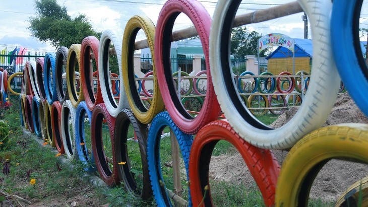 Từ những chiếc lốp xe bỏ đi và những phế liệu khác, các giáo viên trường Mẫu giáo Hoa Sen (xã Tú An, thị xã An Khê, tỉnh Gia Lai) đã sáng tạo chế thành những món đồ chơi độc đáo cho trẻ.