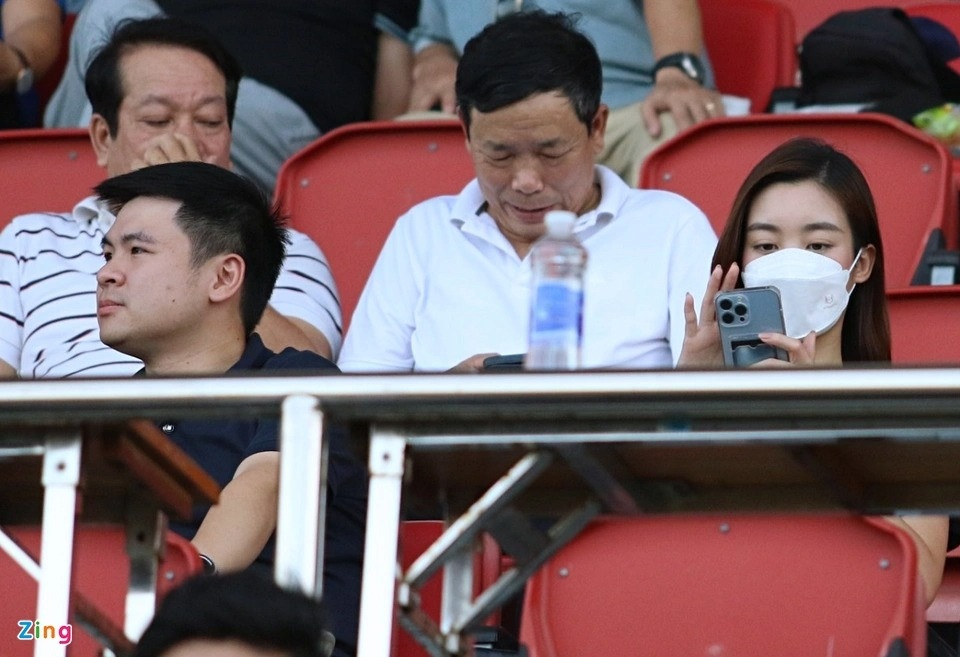 Đỗ Mỹ Linh xem bóng đá cùng Chủ tịch CLB Hà Nội tại Đà Nẵng. Ảnh: Nguyễn Định. |