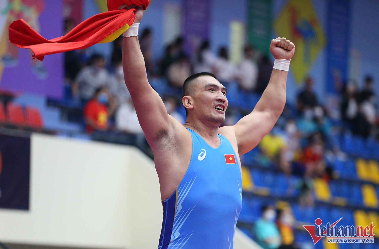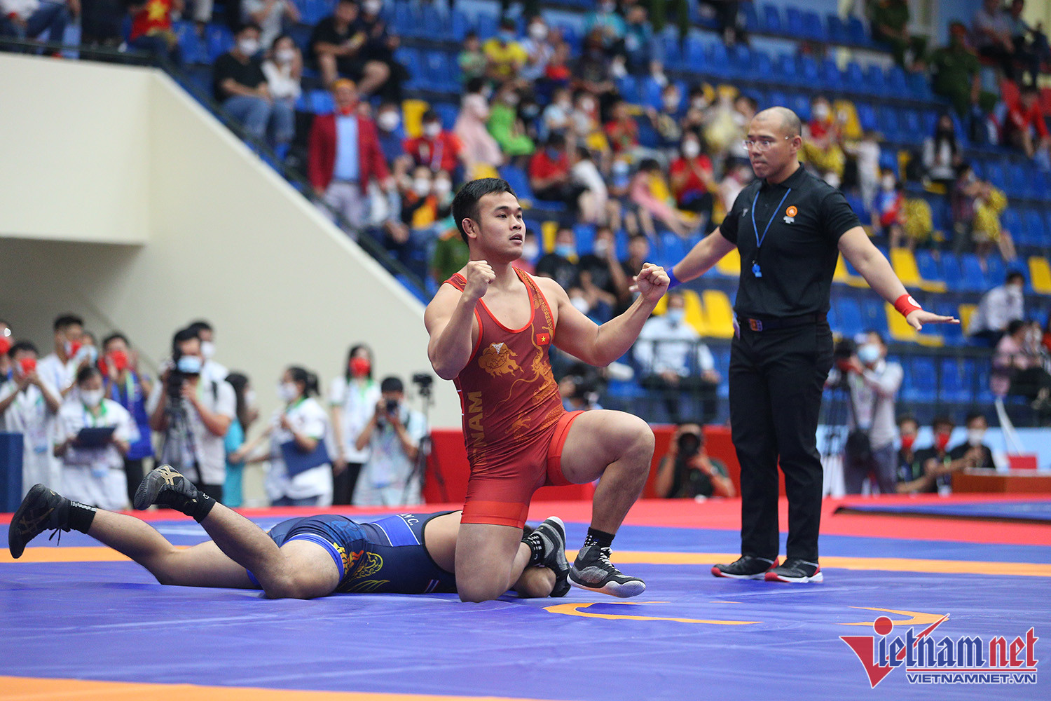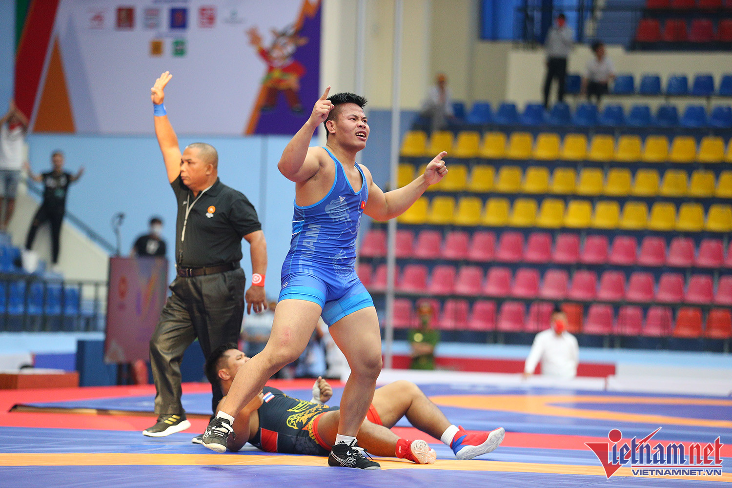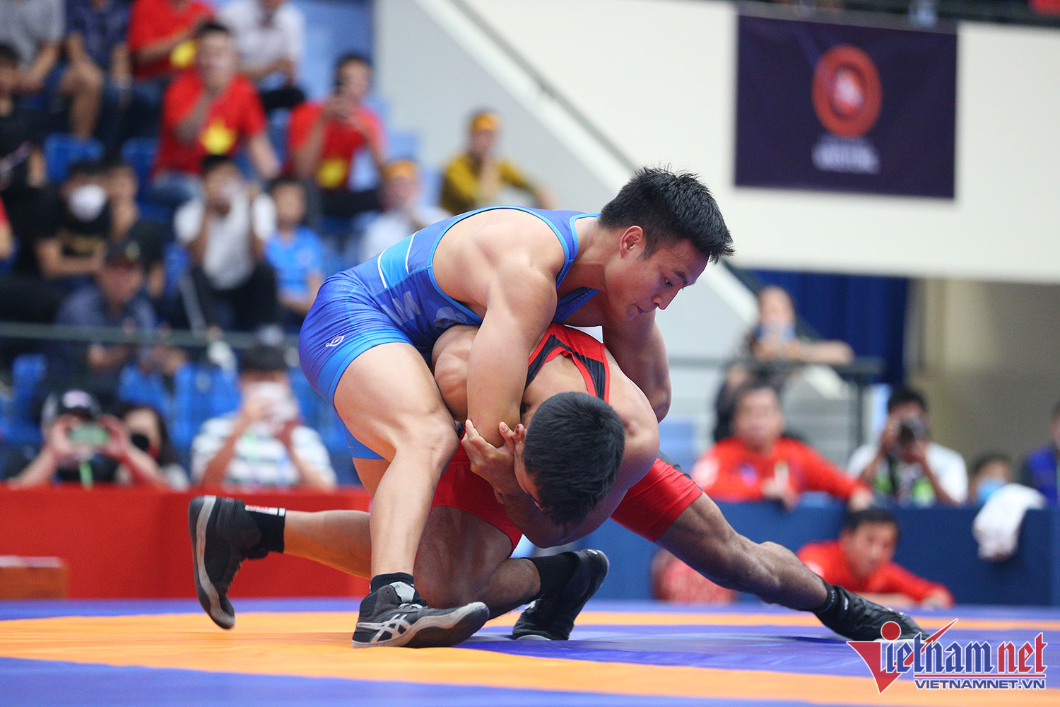 Môn vật SEA Games 31 chính thức tranh tài với nội dung vật cổ điển ở 6 hạng cân: 60kg, 67kg, 77kg, 87kg, 97kg và 130kg nam. Ở lượt thi đấu sáng, các đại diện Việt Nam thể hiện sức mạnh hoàn toàn vượt trội để giành cả sáu suất vào chung kếtCác đô vật Việt Nam có khả năng "kết liễu" đối thủ chỉ sau ít giây thi đấuĐô vật Bùi Tiến Hải mở màn "cơn mưa" HCV cho đội tuyển vật Việt Nam khi đánh bại đại diện Lào - Khamlar Samavong với tỷ số 13-5 ở hạng 60kg, cách biệt 8 điểm theo luật thi đấu đã giúp Tiến Hải giành chiến thắng tuyệt đối.Bùi Mạnh Hùng (67kg) cũng không cho đối thủ cơ hộiNghiêm Đình Hiếu (87kg) dễ dàng thắng đối thủ để đóng góp 1 HCV cho đội tuyển vật Việt NamCác đô vật Việt Nam thể hiện sức mạnh vượt trộiTừ hạng cân nhỏ tới hạng cân nặng, các đô vật Việt Nam đều không có đối thủCác đối thủ chỉ biết phòng thủ, nhưng đều bất lực trước khi chịu thuaĐòn khóa rất hiệu quả của đô vật Việt NamỞ trận đấu thứ 5 của đội tuyển Việt Nam, Nguyễn Minh Hiếu (97kg) gặp đôi chút khó khăn trước đối thủ Thái Lan Anucha Yospanya. Anh bị đối thủ đánh chạm gối xuống sàn, từ đó rơi vào thế để đối thủ tóm lưng. Nguyễn Minh Hiếu thực hiện liên tiếp 3 pha lật người, trước khi tung ra một đòn ném xuất sắc để giành liên tiếp 3 điểm, tỷ số 9-1 giúp anh mang về tấm HCV thứ 5. Tại lượt thi đấu cuối cùng, Hà Văn Hiếu không gặp chút khó khăn trước đối thủ Singapore. Đô vật từng 3 lần vô địch SEA Games chỉ mất 52 giây để tạo ra chiến thắng hoàn hảo 8-0, hoàn tất ngày vàng trọn vẹn đầu tiên của vật Việt Nam tại SEA Games 31 với 6 HCVĐô vật Việt Nam ăn mừng điệu RonaldoĐây là kỳ SEA Games cuối cùng của Hà Văn HiếuAnh rất phấn khíchTấm HCV SEA Games thứ 4 của "người khổng lồ" Hà Văn HiếuVật Việt Nam khả năng sẽ thâu tóm gần như toàn bộ các HCV ở SEA Games 31.