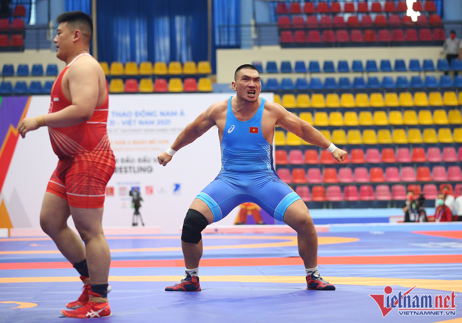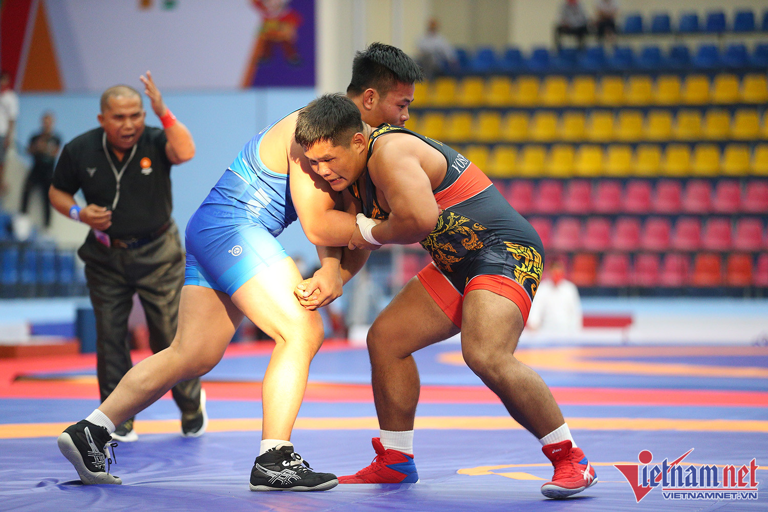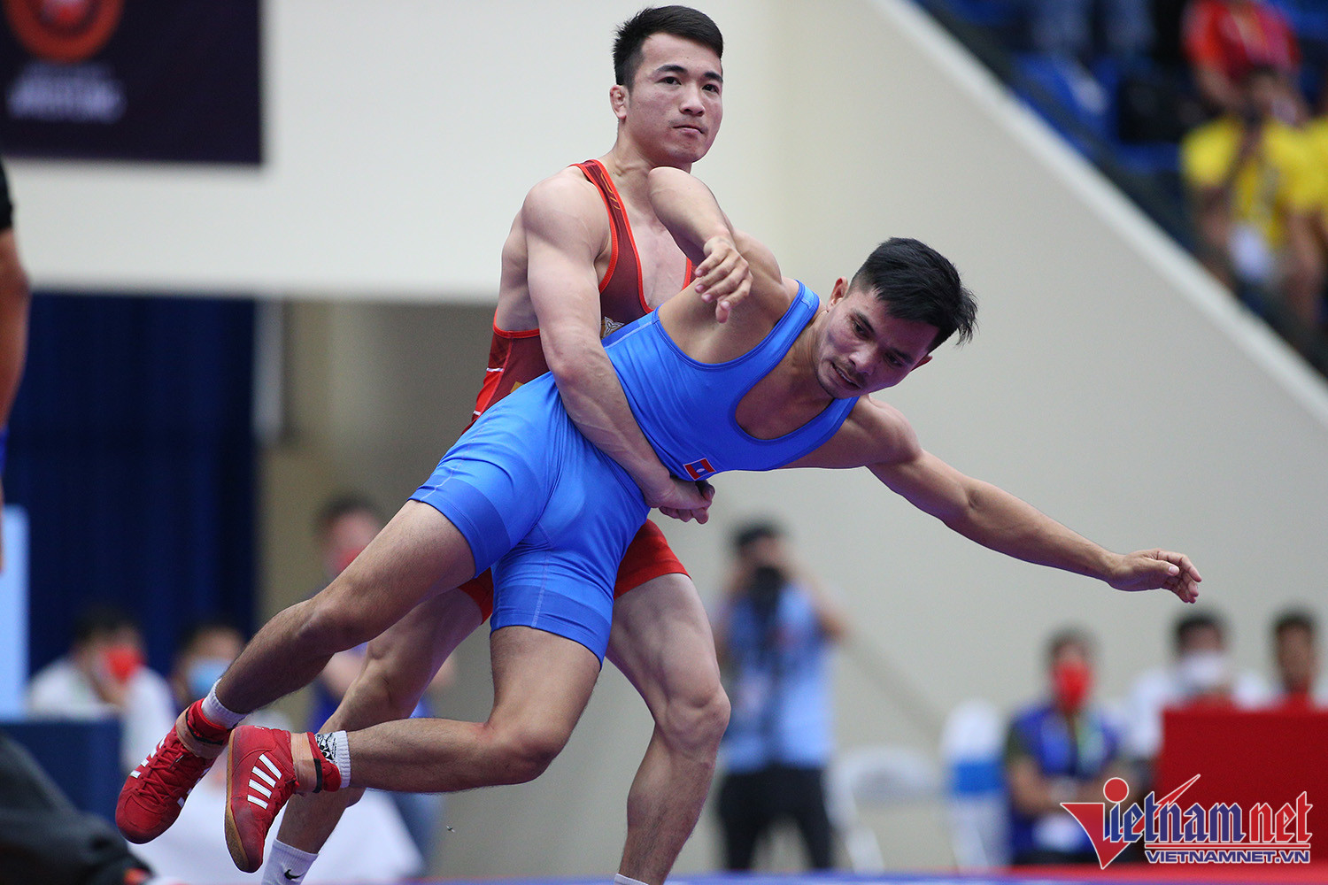 Môn vật SEA Games 31 chính thức tranh tài với nội dung vật cổ điển ở 6 hạng cân: 60kg, 67kg, 77kg, 87kg, 97kg và 130kg nam. Ở lượt thi đấu sáng, các đại diện Việt Nam thể hiện sức mạnh hoàn toàn vượt trội để giành cả sáu suất vào chung kếtCác đô vật Việt Nam có khả năng "kết liễu" đối thủ chỉ sau ít giây thi đấuĐô vật Bùi Tiến Hải mở màn "cơn mưa" HCV cho đội tuyển vật Việt Nam khi đánh bại đại diện Lào - Khamlar Samavong với tỷ số 13-5 ở hạng 60kg, cách biệt 8 điểm theo luật thi đấu đã giúp Tiến Hải giành chiến thắng tuyệt đối.Bùi Mạnh Hùng (67kg) cũng không cho đối thủ cơ hộiNghiêm Đình Hiếu (87kg) dễ dàng thắng đối thủ để đóng góp 1 HCV cho đội tuyển vật Việt NamCác đô vật Việt Nam thể hiện sức mạnh vượt trộiTừ hạng cân nhỏ tới hạng cân nặng, các đô vật Việt Nam đều không có đối thủCác đối thủ chỉ biết phòng thủ, nhưng đều bất lực trước khi chịu thuaĐòn khóa rất hiệu quả của đô vật Việt NamỞ trận đấu thứ 5 của đội tuyển Việt Nam, Nguyễn Minh Hiếu (97kg) gặp đôi chút khó khăn trước đối thủ Thái Lan Anucha Yospanya. Anh bị đối thủ đánh chạm gối xuống sàn, từ đó rơi vào thế để đối thủ tóm lưng. Nguyễn Minh Hiếu thực hiện liên tiếp 3 pha lật người, trước khi tung ra một đòn ném xuất sắc để giành liên tiếp 3 điểm, tỷ số 9-1 giúp anh mang về tấm HCV thứ 5. Tại lượt thi đấu cuối cùng, Hà Văn Hiếu không gặp chút khó khăn trước đối thủ Singapore. Đô vật từng 3 lần vô địch SEA Games chỉ mất 52 giây để tạo ra chiến thắng hoàn hảo 8-0, hoàn tất ngày vàng trọn vẹn đầu tiên của vật Việt Nam tại SEA Games 31 với 6 HCVĐô vật Việt Nam ăn mừng điệu RonaldoĐây là kỳ SEA Games cuối cùng của Hà Văn HiếuAnh rất phấn khíchTấm HCV SEA Games thứ 4 của "người khổng lồ" Hà Văn HiếuVật Việt Nam khả năng sẽ thâu tóm gần như toàn bộ các HCV ở SEA Games 31.