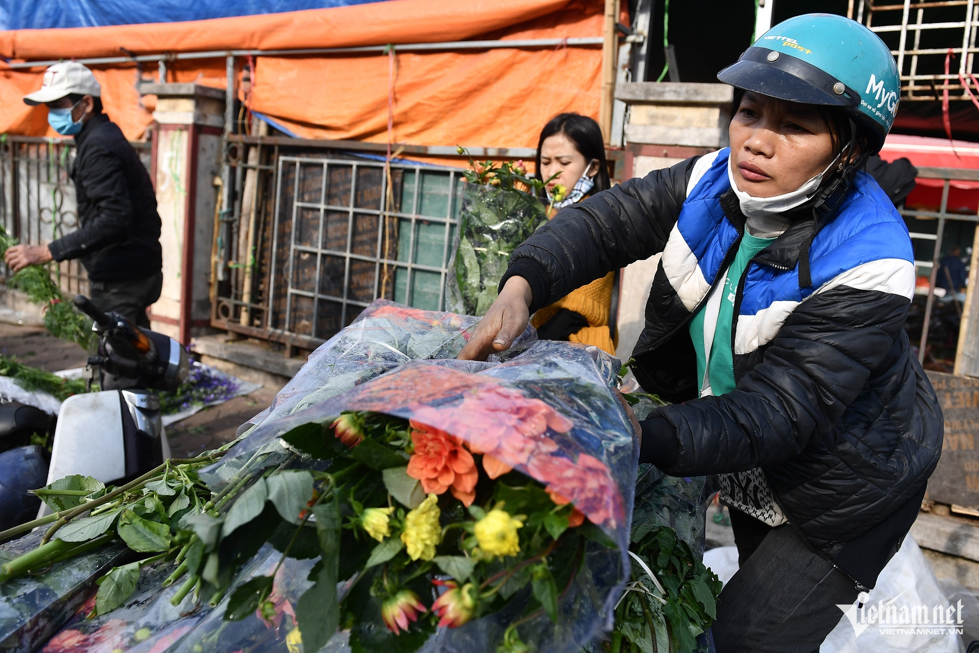 Anh Trung và vợ ở phố An Dương đến chợ Quảng An sắm Tết. Hai vợ chồng anh than hoa chiều cuối năm bán vẫn còn rất đắt. Sau gần 1 tiếng loay hoay, họ mới mua được vài cành dơn và tuyết mai mang về.