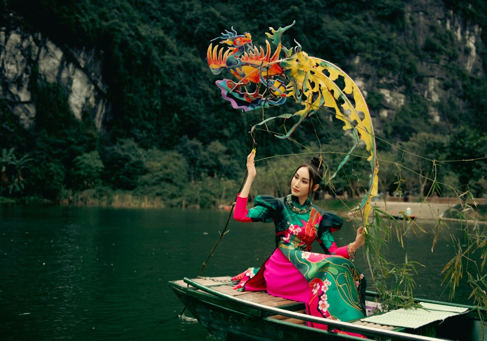 Đoàn Hồng Trang vừa có chuyến thăm quan và chụp ảnh tại Tràng An (Ninh Bình). Cô tái hiện văn hóa cây nêu ngày Tết trong những bộ áo dài cũng như quảng bá nét đẹp thơ mộng của địa danh.