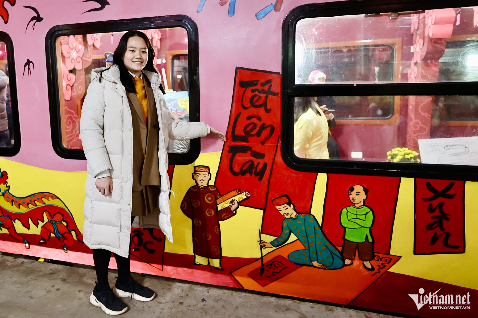Em Ái Minh chụp ảnh cùng toa xe đặc biệt của đoàn tàu SE1. Minh cho biết, đây là lần đầu tiên em nhìn thấy 1 toa tàu được trang trí đẹp và ý nghĩa như thế này.