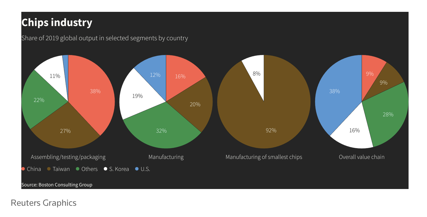 Theo Boston Consulting Group, tính đến năm 2019, gần 40% hoạt động sản xuất phụ trợ toàn cầu là ở Trung Quốc, trong khi ở Mỹ chỉ là 2%, và có tới 27% nằm tại Đài Loan (Trung Quốc), nơi đang bị che phủ bởi lo ngại về bất ổn địa chính trị giữa hai bờ eo biển.
