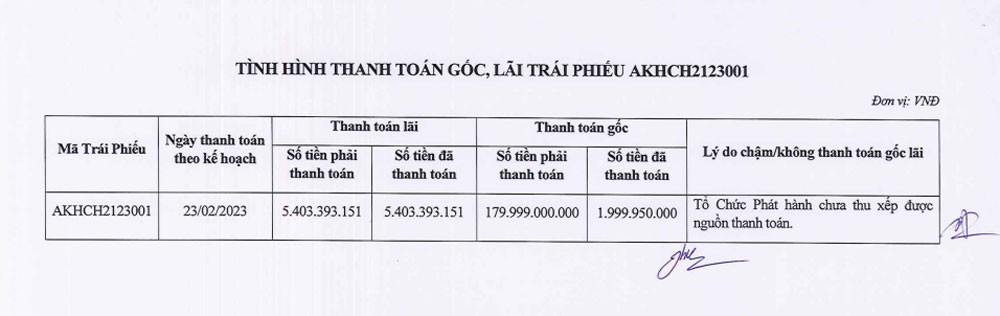 CTCP Đầu tư An Khải Hưng vừa công bố thông tin bất thường về việc chậm thanh toán gốc, lãi trái phiếu AKHCH2123001. Cụ thể, theo kế hoạch An Khải Hưng phải trả gần 180 tỷ đồng trái phiếu vào ngày 23/2 nhưng cho đến nay mới thanh toán được gần 2 tỷ đồng tiền gốc và khoản tiền lãi hơn 5,4 tỷ đồng.