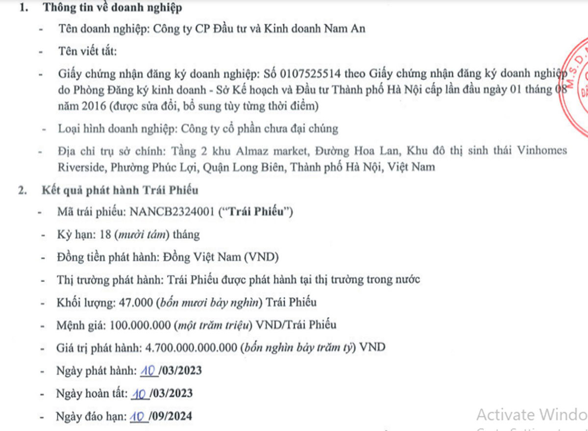 Theo Sở Giao dịch Chứng khoán Hà Nội (HNX), CTCP Đầu tư và Kinh doanh Nam An hôm 10/3 phát hành thành công lô trái phiếu trị giá 4.700 tỷ đồng, với kỳ hạn 18 tháng, lãi suất 13%/năm, kết hợp giữa lãi suất cố định và thả nổi.
