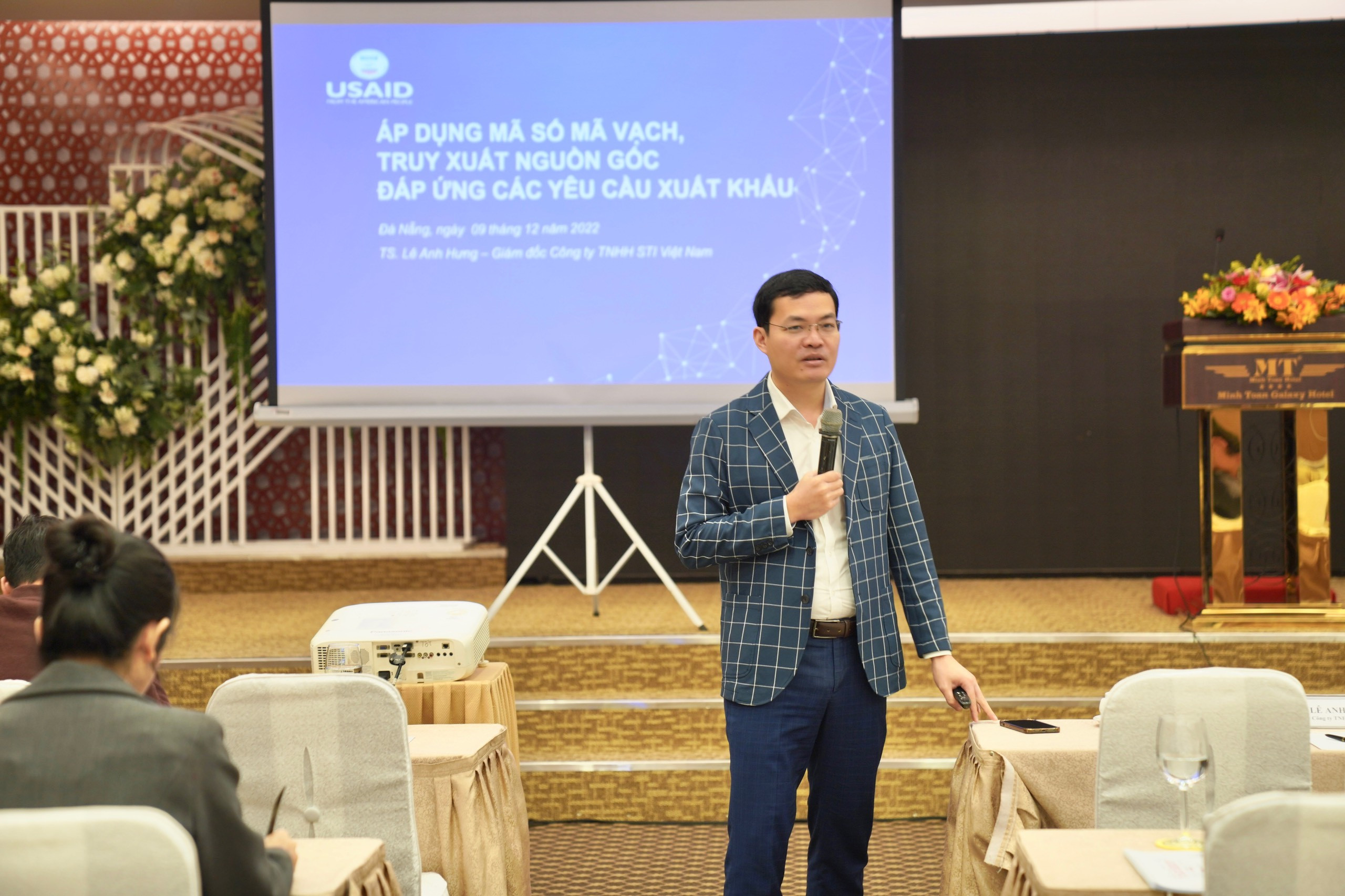 Ông Lê Anh Hưng - Giám đốc Công ty TNHH STI Việt Nam đã trình bày về tổng quan về mã số mã vạch, ứng dụng của mã số mã vạch trong thực tế và hướng dẫn chức năng, cách sử dụng hệ thống quản lý mã số mã vạch, truy xuất nguồn gốc hàng hóa tại Việt Nam. Ông cũng giới thiệu Tiêu chuẩn Việt Nam 12850: 2019 và các bước xây dựng hệ thống truy xuất nguồn gốc hàng hóa.