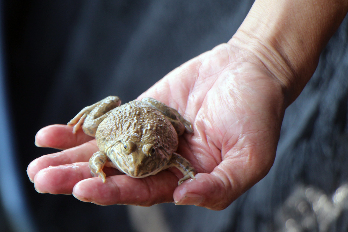 “Khu vực tôi ở là Cồn Sơn, ếch sinh sống trong tự nhiên nhiều. Chưa kể số lượng ếch mọi người phóng sinh vào dịp rằm lớn. Ếch sống trên cồn rất dạn dĩ. Đặc biệt, khoảng 1 năm trước, trong lúc tôi cất nhà sàn thì gặp rất nhiều con ếch. Từ đó, tôi nảy ra ý tưởng 'ếch làm xiếc' để làm đa dạng du lịch trên Cồn Sơn”, anh Càng nói.