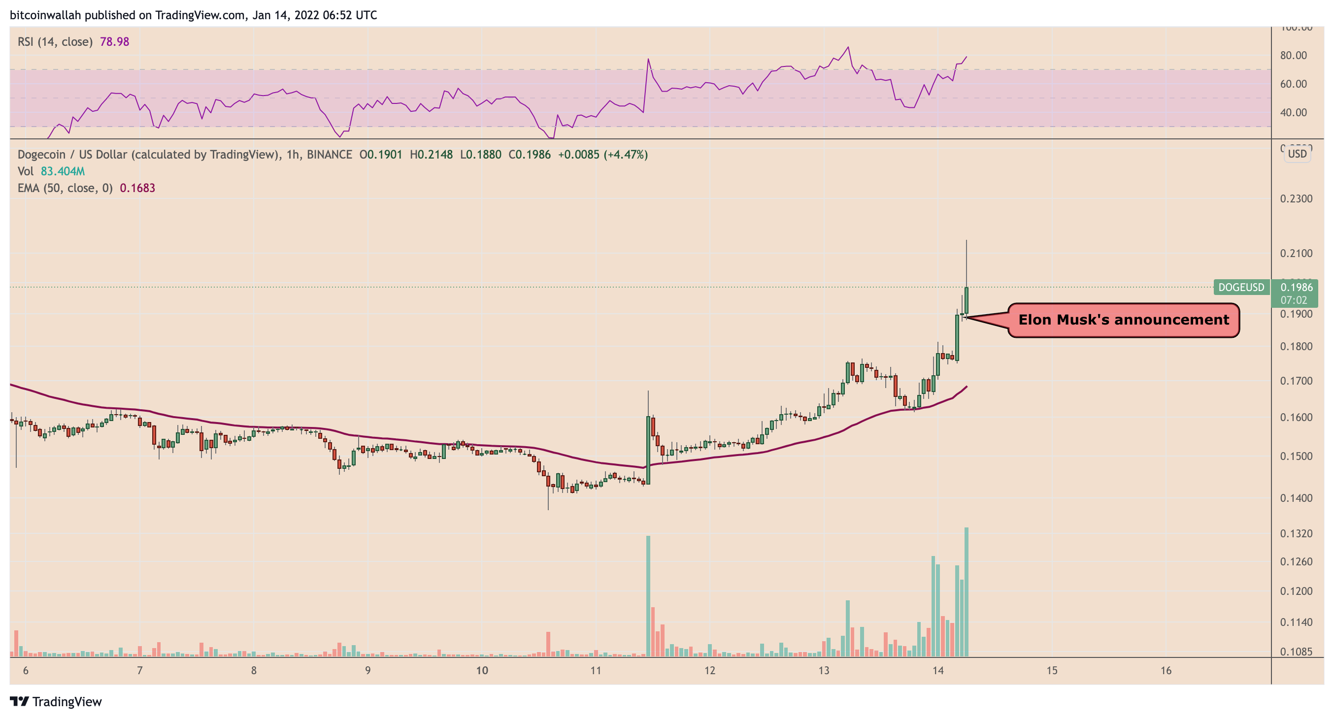 Dogecoin đã tăng 13%, chạm mức cao nhất trong 30 ngày là 0,215 USD sau tuyên bố của Elon Musk (Biểu đồ: Trading View).