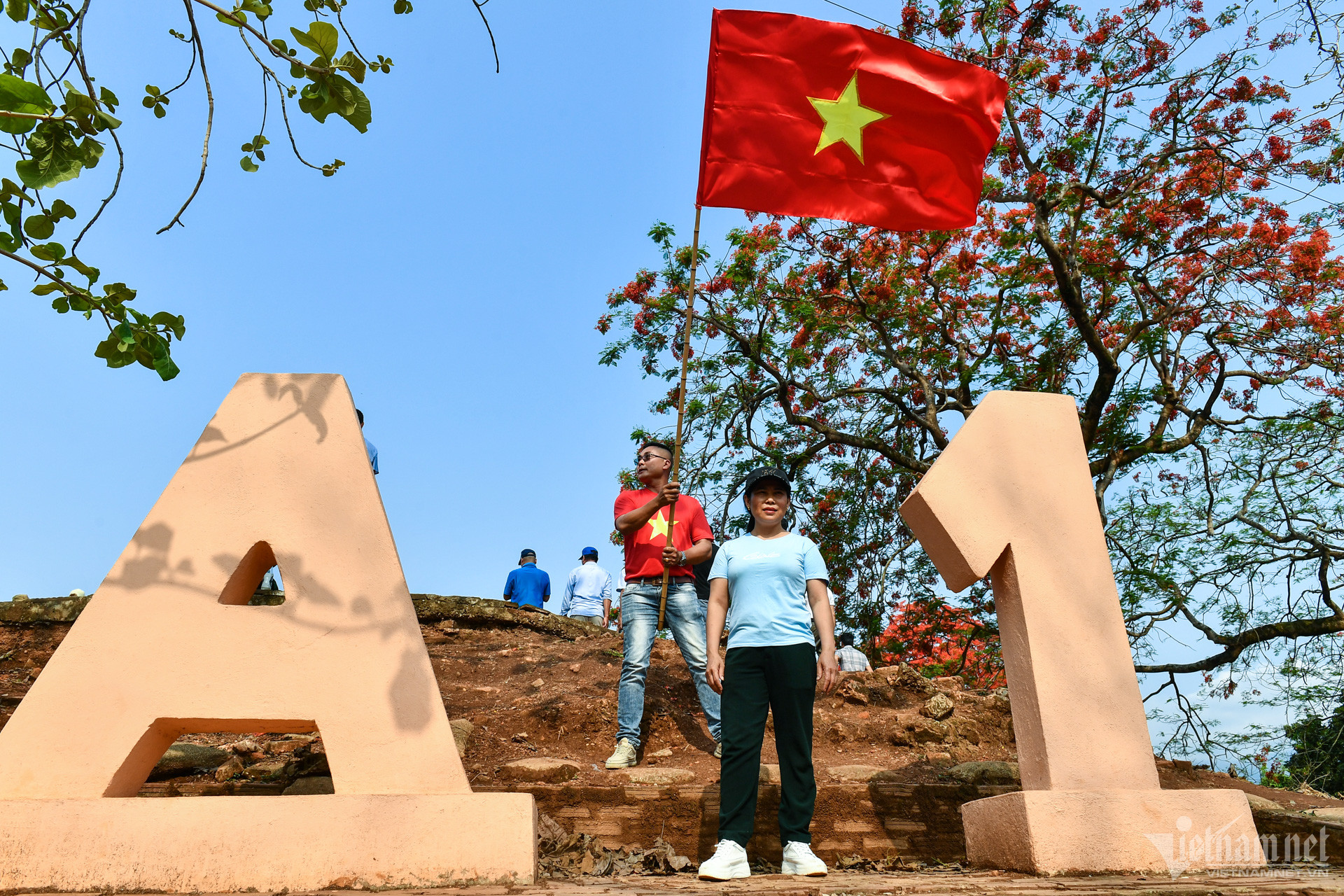 Du khách vui vẻ chụp hình check-in tại đồi A1 trong trang phục truyền thống hoặc áo có hình cờ đỏ sao vàng.
