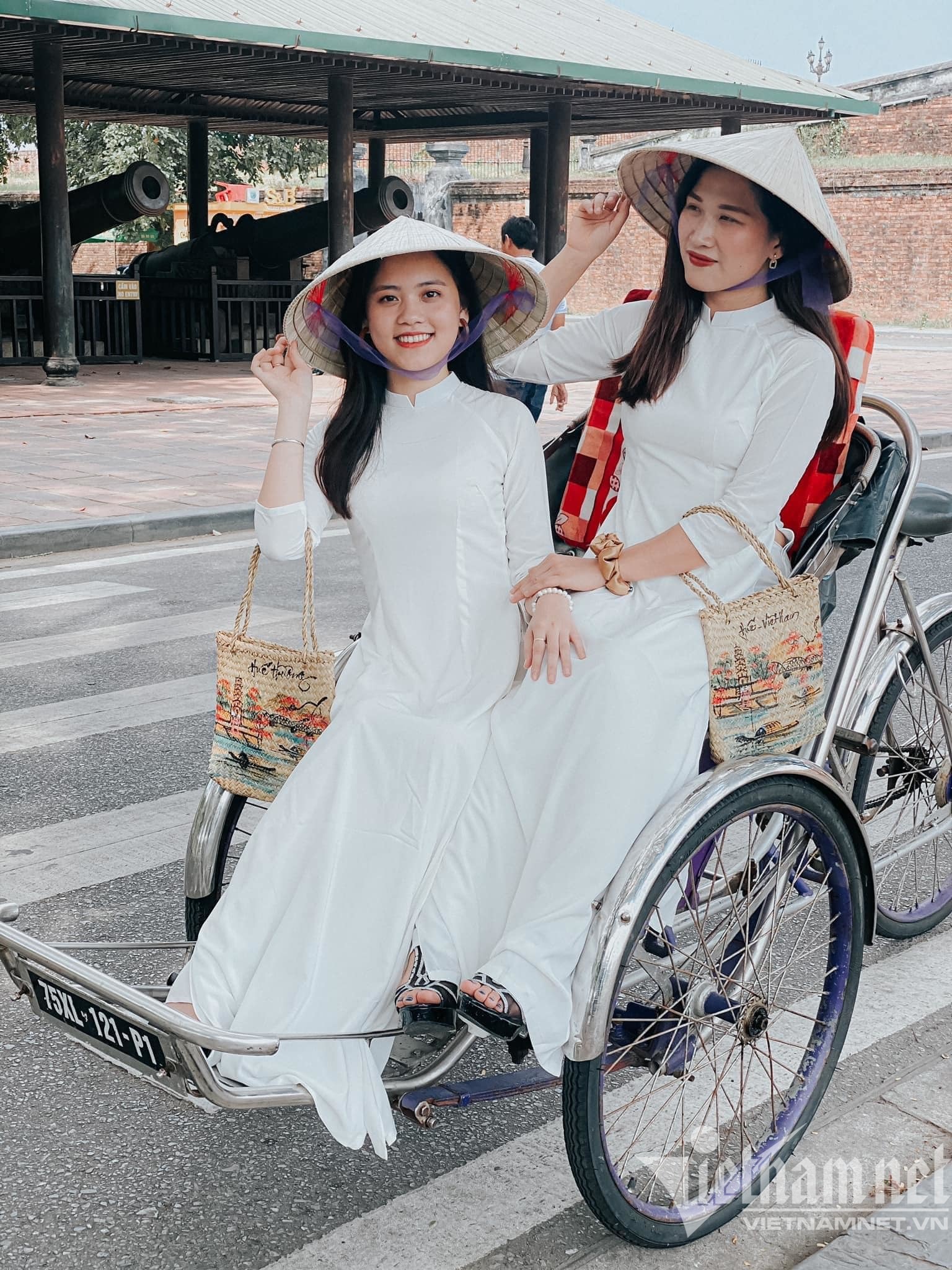 Đôi bạn chọn tà áo dài trắng, đội nón lá khi khám phá cung đình Huế