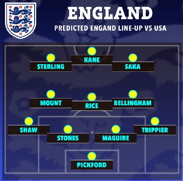 Anh: Pickford; Trippier, Stones, Maguire, Shaw; Rice, Bellingham; Saka, Mount, Sterling; Kane
