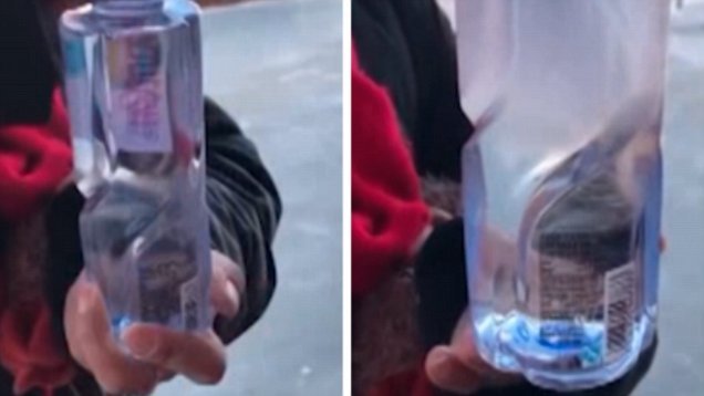Một chai nước đã lập tức đóng băng ngay sau khi được đem ra ngoài trời trong ở cái lạnh -20 độ C ở phía bắc Trung Quốc.