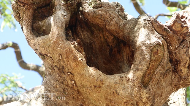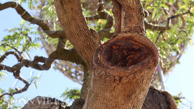 Trên thân cây, với nhiều vết sẹo lớn nhỏ đã khiến cây me mang vẻ cổ kính, thăng trầm qua thời gian. Ông Phong đã phải thuê cẩu 8 tấn để đưa cây me chua từ Đồng Nai vào Đà Lạt tham gia triển lãm.