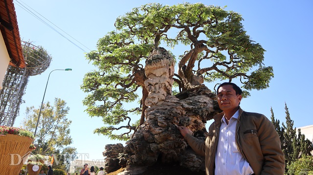 Theo quan sát của phóng viên báo điện tử DANVIET.VN, tính từ phần đáy chậu, cây me cao khoảng 3m, cùng với đó bộ tán với rất nhiều nhánh, tay rộng đến 3,2m. Bên cạnh đó, cây me đã được ông Phong ghép phần đá bên dưới rất đẹp, bên dưới chậu được chứa nước, giúp tôn thêm vẻ đẹp của cây.