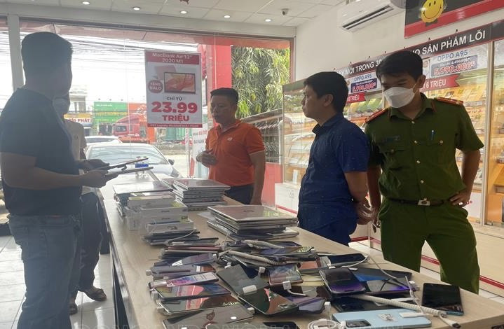 Tại hiện trường, tang vật thu giữ: 1 kìm động lực, 1 con dao, 1 mỏ lết, 54 điện thoại di động, 22 laptop, 1 máy tính bảng (tổng giá trị tài sản hơn 1 tỷ đồng).