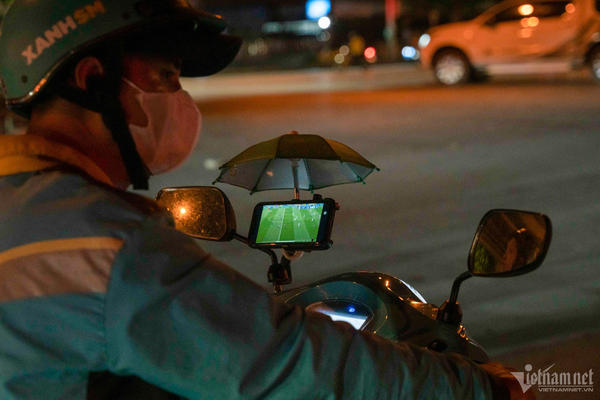 Một tài xế xe ôm công nghệ trong khi đợi bắt khách ở gần một quán bia cũng mở điện thoại để xem trận đấu của tuyển Anh lúc 23h.