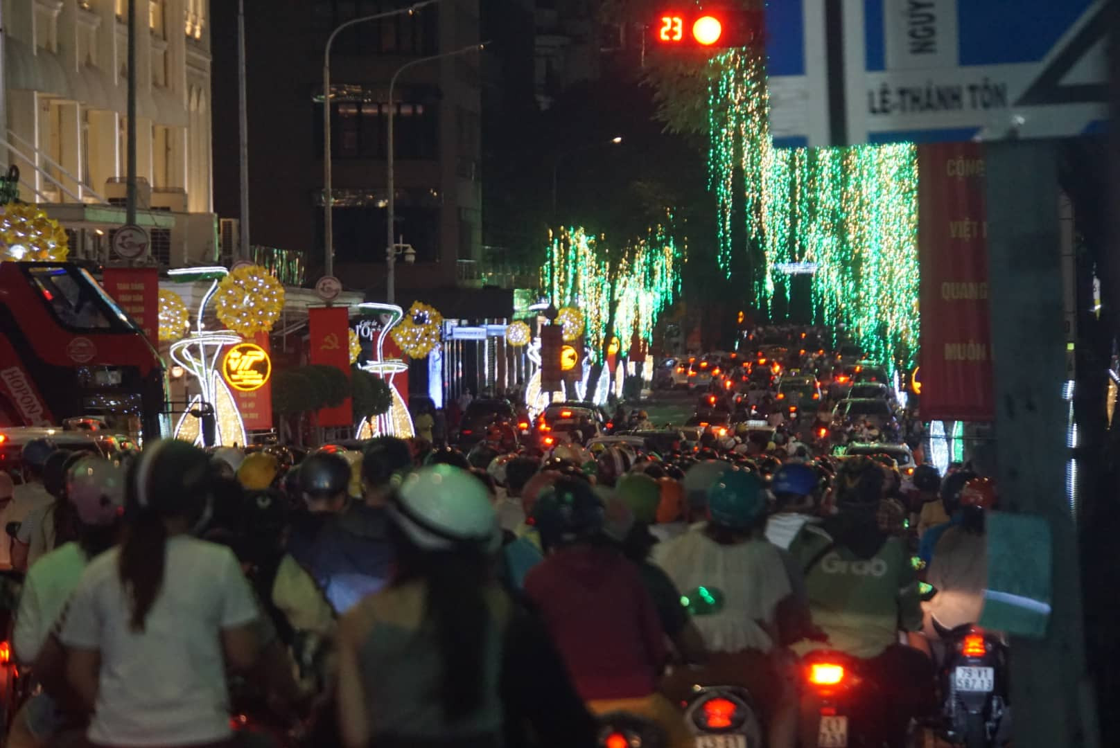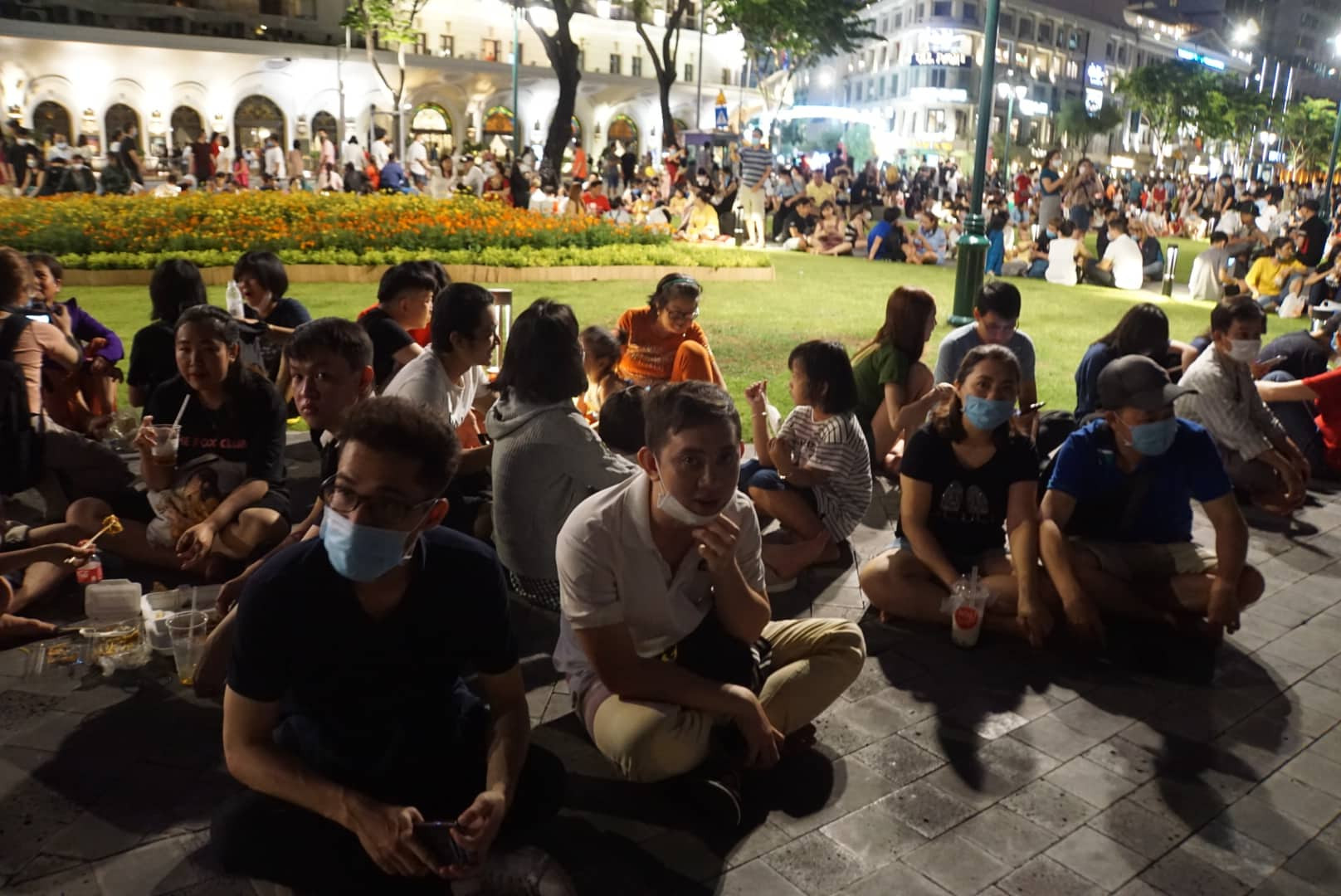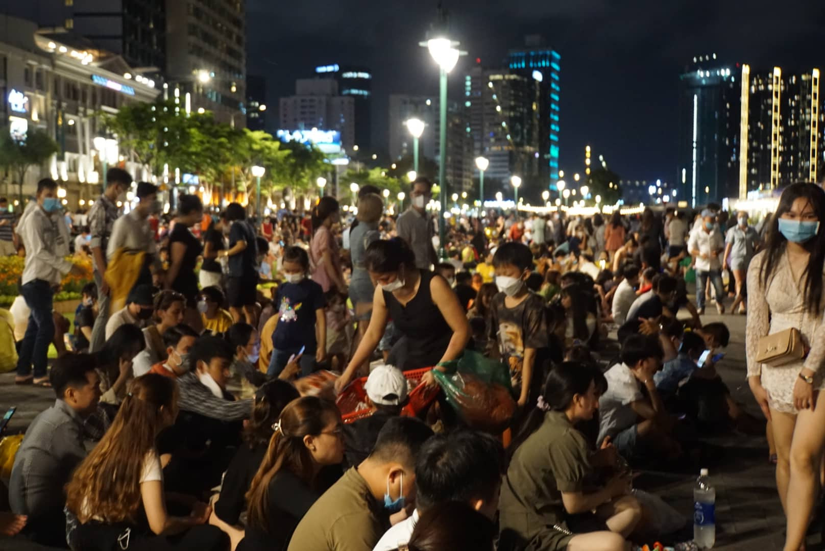 Lúc 19h30, người dân TP.HCM đổ về các điểm vui chơi khu trung tâm như phố đi bộ Nguyễn Huệ, công viên Bến Bạch Đằng, khu vực đường sách, các điểm ăn uống, trung tâm thương mại... để vui chơi và chờ xem bắn pháo hoa. Các tuyến đường giao thông vào trung tâm trong tình trạng đông đúc.