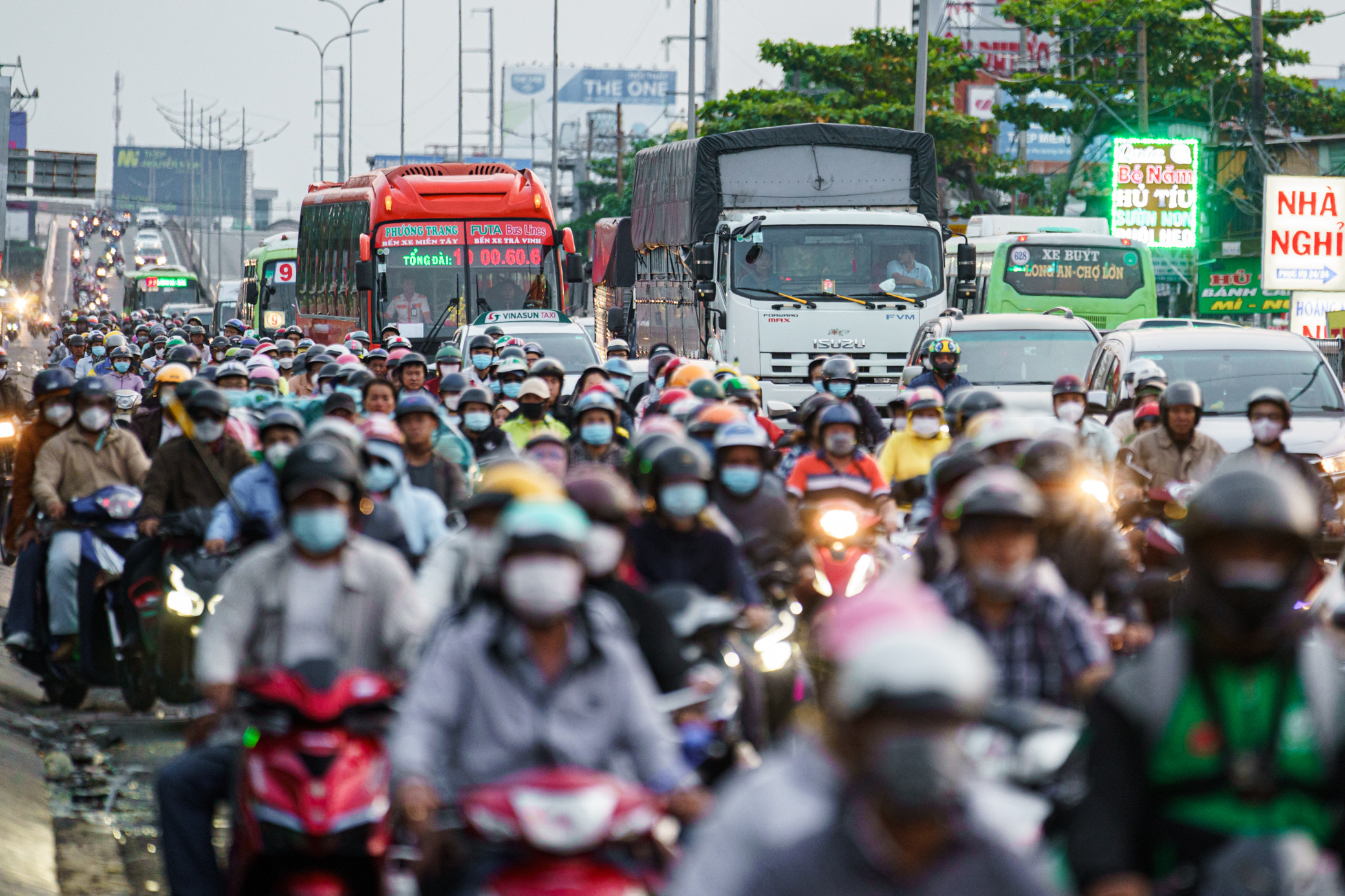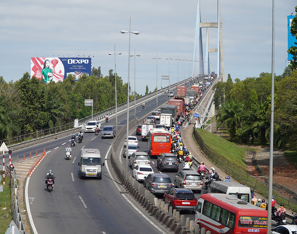 Tại khu vực cầu Mỹ Thuận (địa phận Vĩnh Long) lượng xe tăng đột biến từ sáng. Dòng xe di chuyển chậm, kẹt cục bộ khoảng 3km trên quốc lộ 1. Từng dòng xe máy, ô tô, xe khách… nối đuôi nhích qua cầu Mỹ Thuận.
