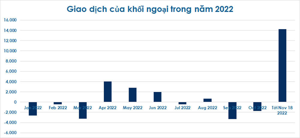 Từ đầu tháng 11, khối ngoại đã mua ròng hơn 14.000 tỷ đồng giá trị cổ phiếu trên TTCK Việt Nam, đảo chiều so với tháng 9 và 10. Tổng cộng trong 11 tháng, khối ngoại mua ròng hơn 12.000 tỷ đồng.