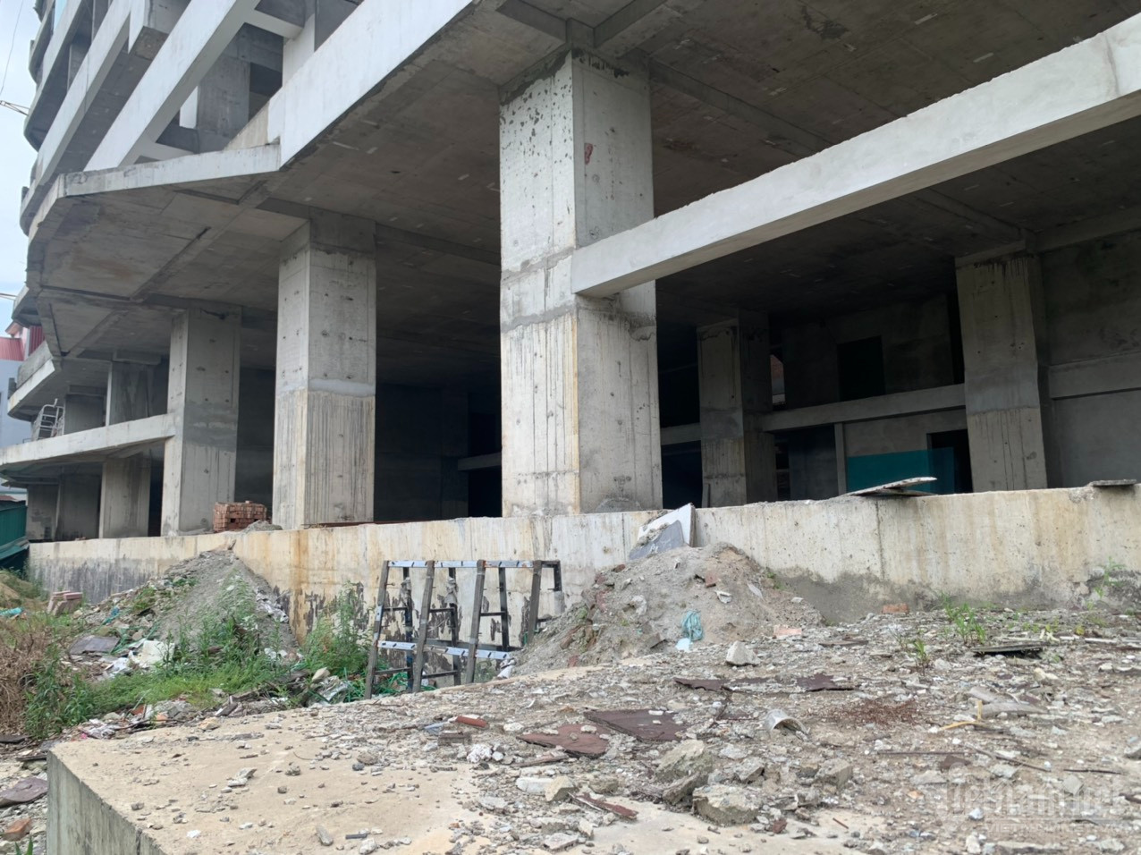 Theo quan sát của PV, dự án đã dừng mọi hoạt động, không có người trông coi. Nhiều mảng tường đã bong tróc, cỏ dại mọc um tùm. Phía bên trong tòa nhà, nhiều vật liệu chất đống ngổn ngang, sắt thép hoen gỉ.