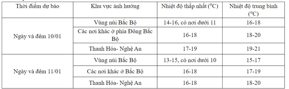 Theo Trung tâm dự báo khí tượng thủy văn quốc gia, hôm nay (10/1), không khí lạnh tràn về sẽ ảnh hưởng đến khu vực Đông Bắc Bắc Bộ; sau đó đến các nơi khác ở phía Đông Bắc Bộ, hầu hết Bắc Trung Bộ và phía Tây Bắc Bộ. Gió Đông Bắc trong đất liền mạnh lên cấp 2-3; vùng ven biển cấp 3.
