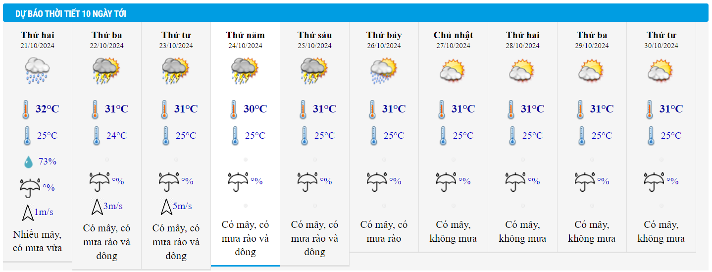 Có mây, có mưa rào và giông rải rác, cục bộ có nơi mưa to. Gió đông đến đông bắc cấp 2-3. Trong mưa giông có khả năng xảy ra lốc, sét và gió giật mạnh.