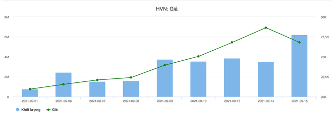 Cổ phiếu HVN đã có 7 phiên tăng liên tục ngay khi thị trường giao dịch trở lại sau kỳ nghỉ lễ Quốc khánh 2/9, trong đó có 4 phiên gần đây nhất là phiên 9/9 đến phiên 14/9 mã này tăng trần và tăng mạnh (phiên 9/9, 13/9 và 14/9 tăng kịch trần, phiên 10/9 tăng 4,59%). Tổng mức tăng của 7 phiên này lên tới 36,75% (tương ứng tăng 7.700 đồng/cổ phiếu).