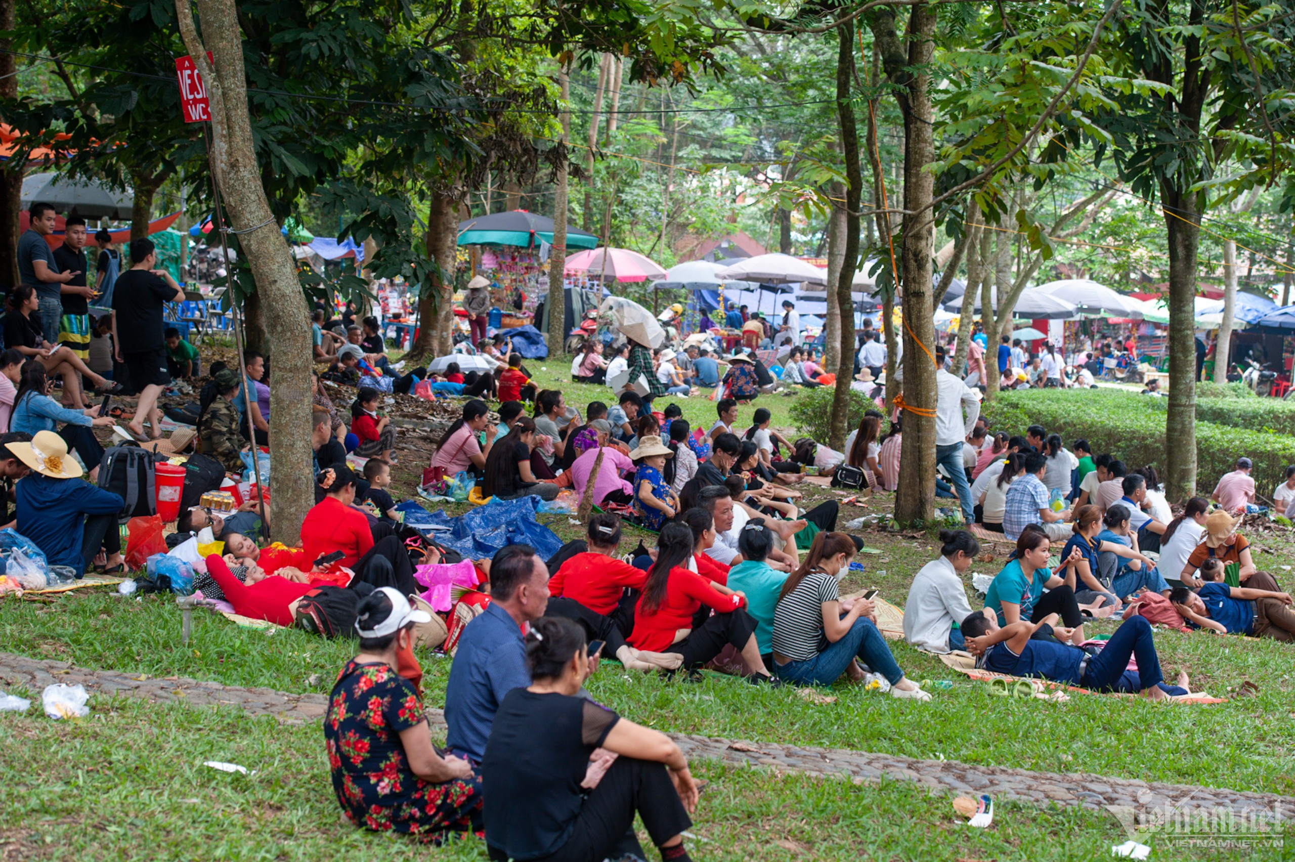 Tại các khu vực bãi cỏ và khu đất trống, hàng trăm người sử dụng dịch vụ thuê chiếu nghỉ ngơi vào buổi trưa và tranh thủ "thụ lộc" lễ vật đã dâng hương.