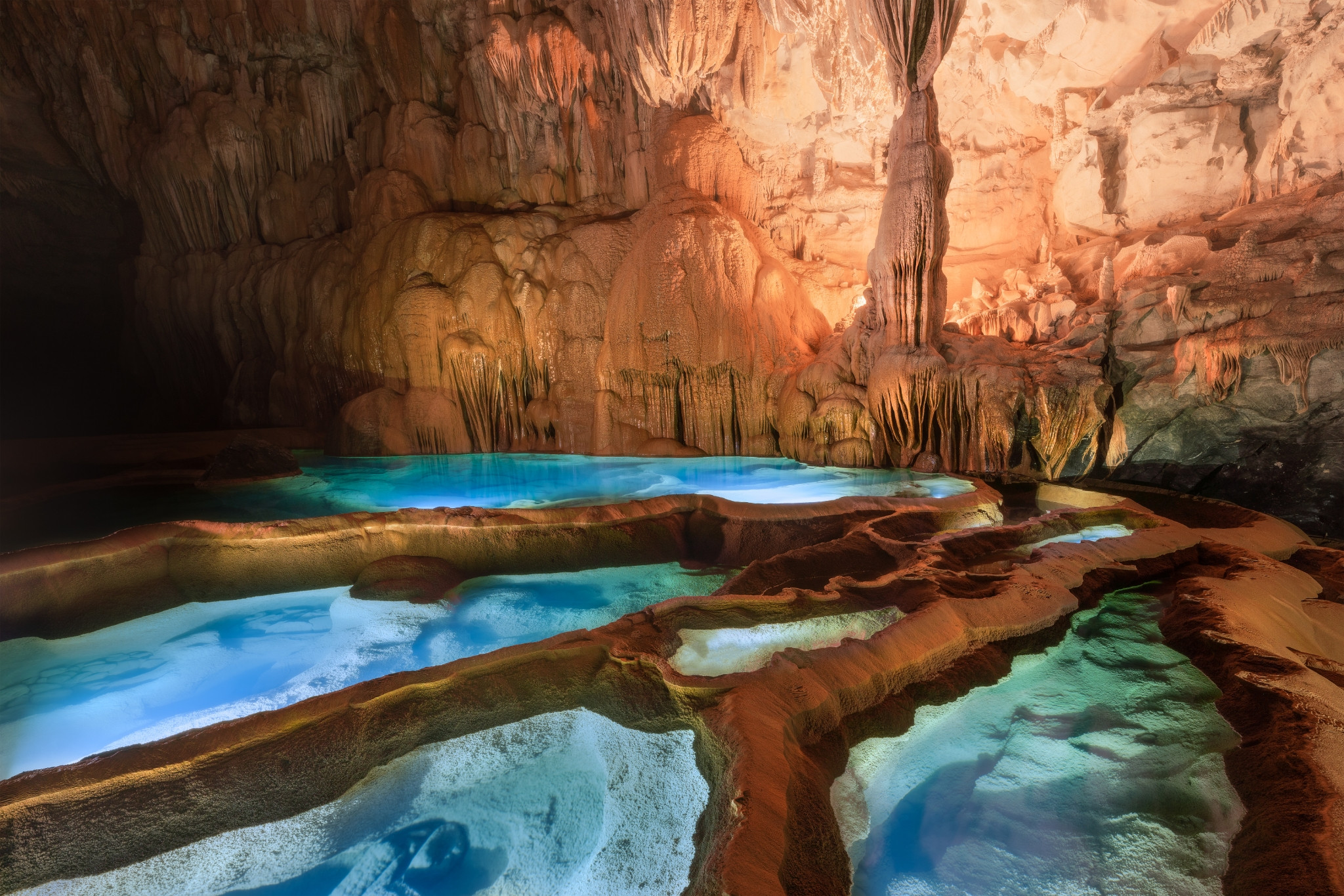 Ngoài thạch nhũ, trong hang còn có những hồ nước bậc thang xanh biếc với nhiều loại cá màu trắng rất lạ, không có mắt do chúng sống trong hang tối quanh năm.