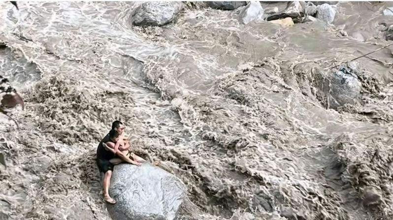 Du khách mắc kẹt giữa dòng nước lũ cuồn cuộn
