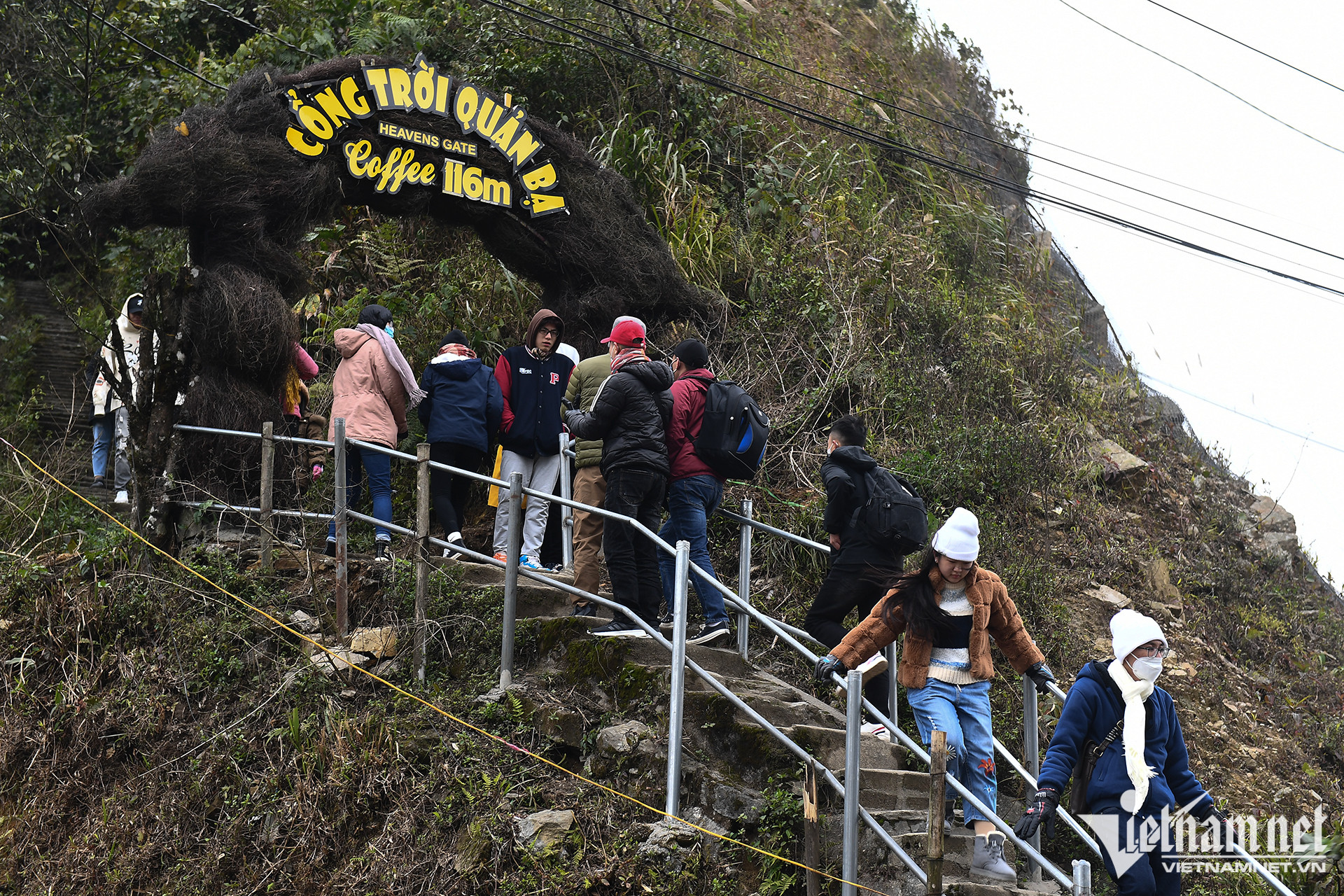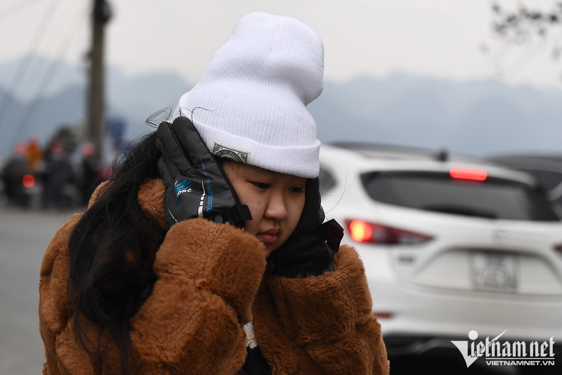 Du khách co ro đi lại cố gắng tìm vị trí đẹp để chiêm ngưỡng và chụp ảnh. Trong các ngày mùng 3 và 4 Tết, nhiệt độ ở vùng cao Tây Bắc dao động từ 6 đến 8 độ C, nơi thấp nhất xuống tới 0 độ C.