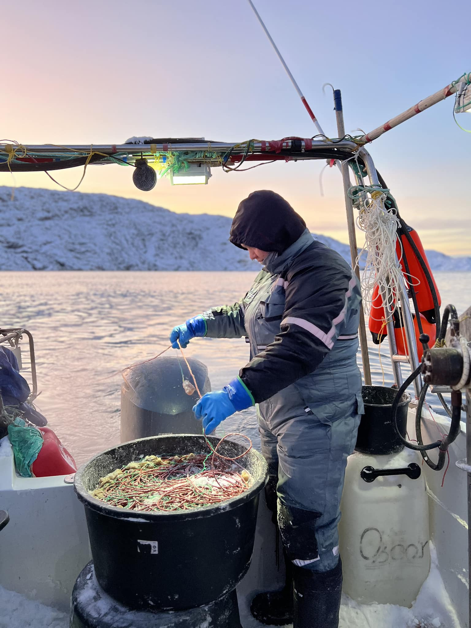 Greenland có 2 ngành công nghiệp chính, một là du lịch, và hai là xuất khẩu cá. Ngư dân ở đây thường phải di chuyển khoảng 40 phút ra xa bờ. Trên hành trình, gió táp vào người lạnh buốt. Bố Laarseeraq lái tàu còn cậu thì chuẩn bị thùng mồi cho cá ăn. Trên tàu có một góc nhỏ để máy sưởi. Khi nào lạnh quá, Laarseeraq lại chạy vội vào sưởi ấm. "Lúc đầu mình đứng ngoài tàu chụp ảnh nhưng chỉ một lúc sau, người lạnh cóng, mình vội chui vô sưởi ấm", chị kể.