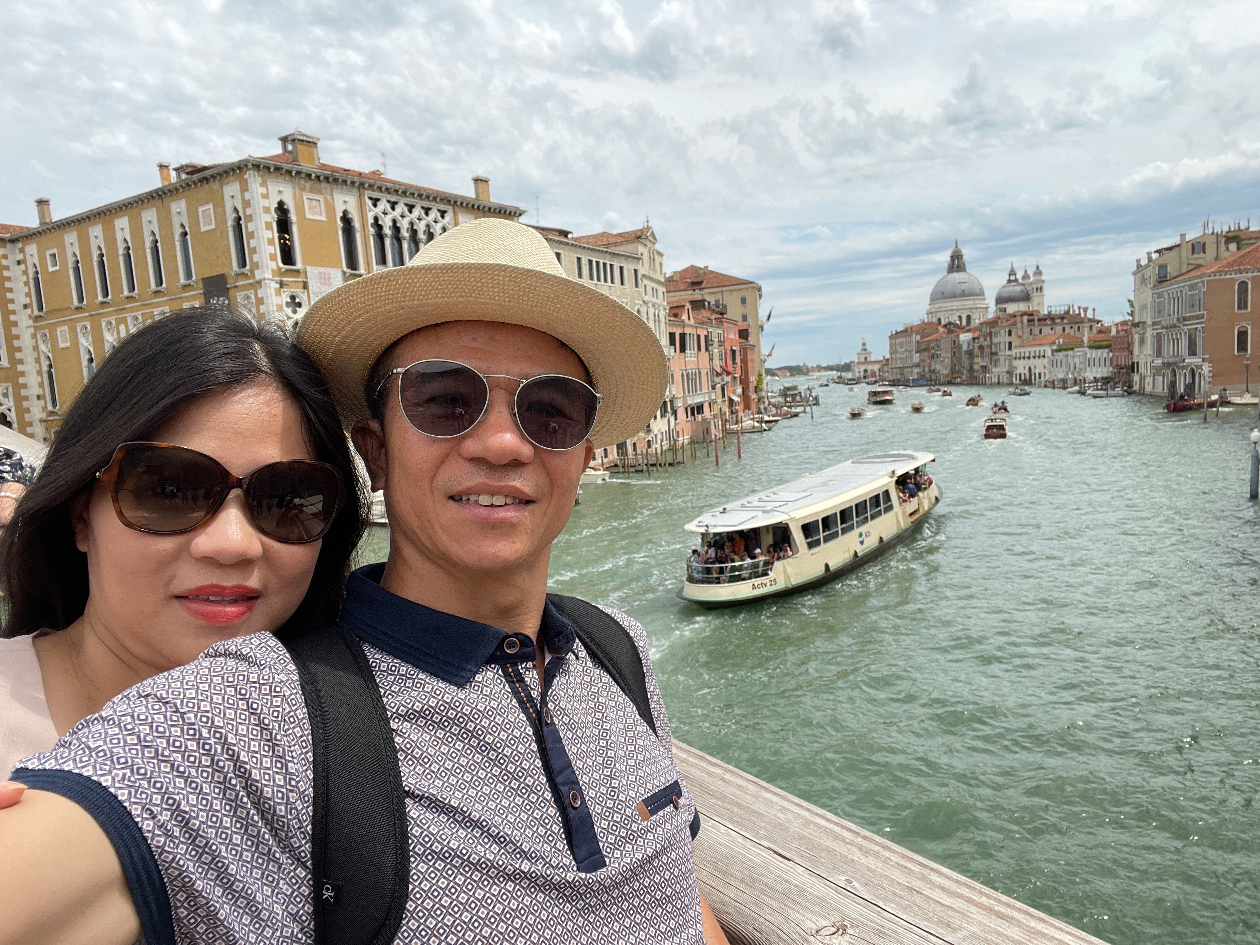 Tác giả và vợ chụp ảnh check-in trên cây cầu Accademia bắc qua Grand Canal, phía xa là nhà thờ Santa Maria