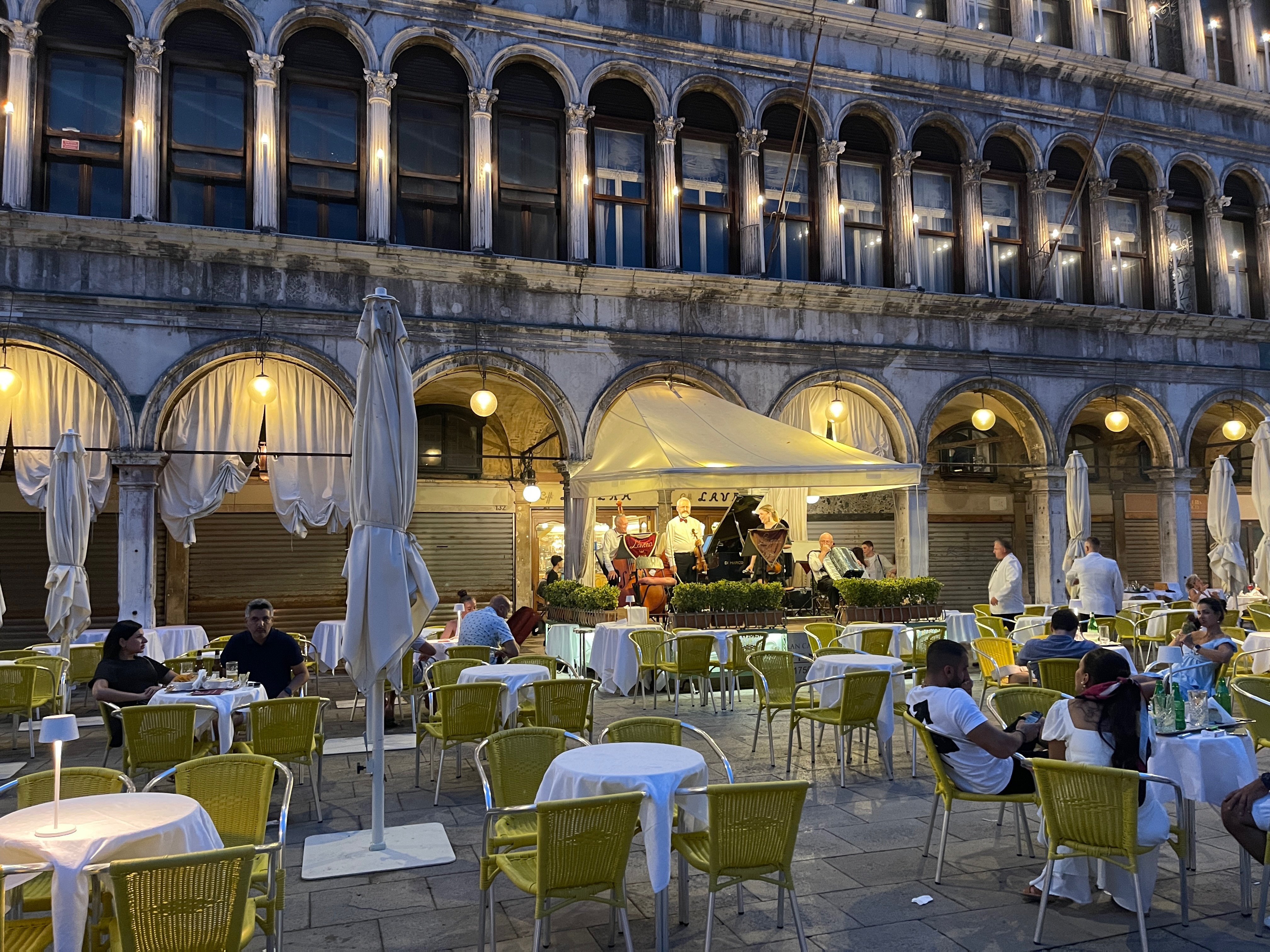 Hai quán cafe nổi tiếng Caffè Florian (1720) và Caffé Lavena (1750) nằm ngay trên quảng trường. Bạn dễ dàng nhận ra chúng vì người ta chơi và hát nhạc sống cả ngày. Đây là hai quán cafe lâu đời nhất nước Ý và lâu đời thứ 2 và 3 trên thế giới, sau quán cafe Procope ở Paris được thành lập năm 1686.