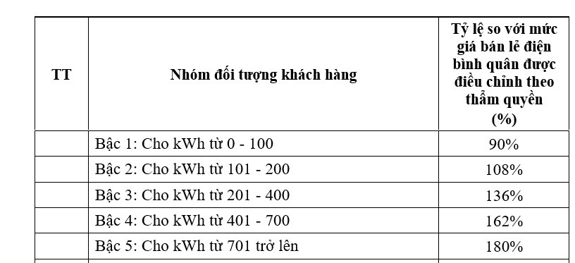 Giá điện các bậc thang từ bậc 1 đến bậc 5 được tính bằng 90-180% giá bán lẻ điện bình quân 1.920,37 đồng một kWh (mức điều chỉnh từ 4/5).