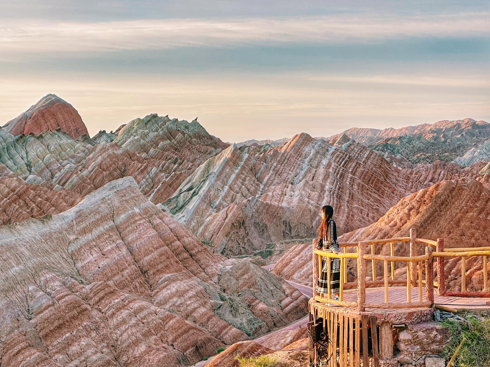Chị Trang đặc biệt ấn tượng với khung cảnh thiên nhiên đẹp lạ tại Công viên địa chất Trương Dịch Đan Hà (tỉnh Cam Túc, Trung Quốc). Nơi đây từng được UNESCO công nhận là di sản thiên nhiên thế giới năm 2009 với cảnh quan tráng lệ, gồm các dãy núi nhiều màu trải dài, hiện lên như những dải lụa đầy màu sắc.