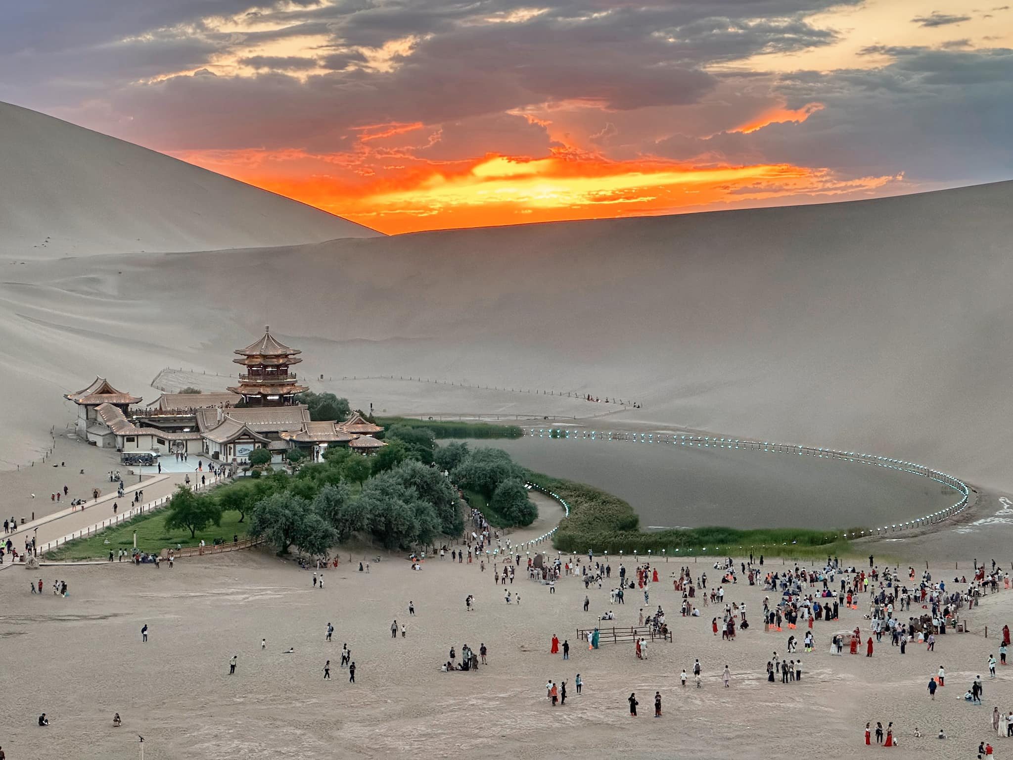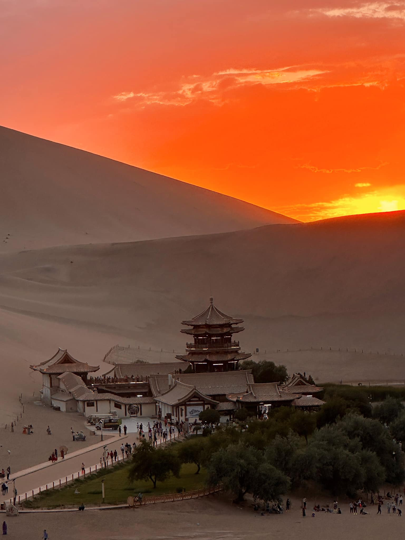 Thành Đôn Hoàng là thị trấn cổ nằm ở phía Tây Bắc tỉnh Cam Túc với tuổi đời lên tới 4.000 năm, được ví như "hòn đảo xanh cô đơn giữa sa mạc khô cằn". Tới đây, du khách được trải nghiệm đón hoàng hôn lúc 9, 10 giờ đêm