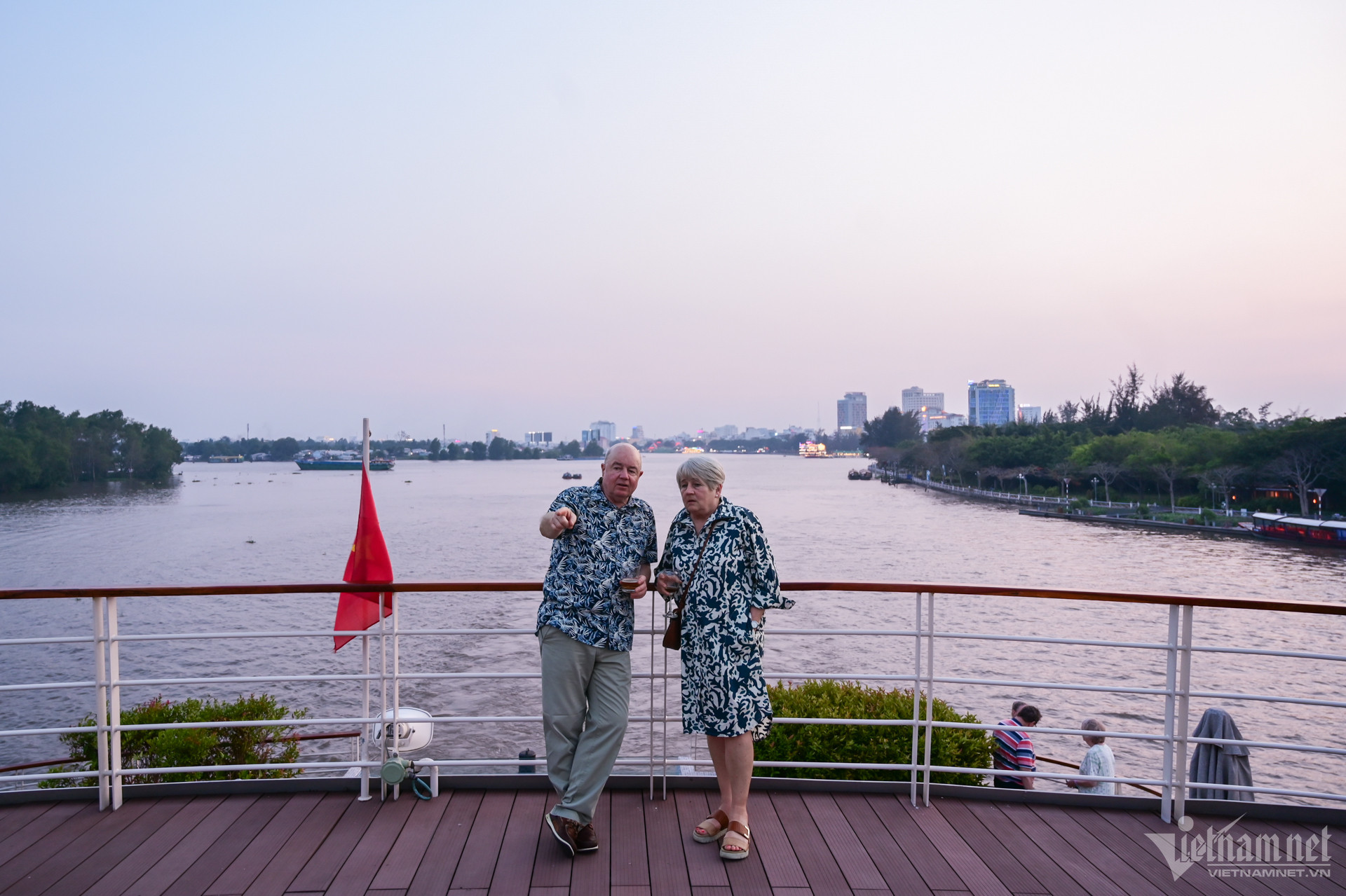 Bà Lauren (du khách Pháp) ghi lại hình ảnh những ghe thuyền ngược xuôi trên dòng sông Hậu trong ánh chiều tim tím. "Tôi muốn đi du lịch kết hợp nghỉ dưỡng mà vẫn có những hoạt động khám phá, tìm hiểu vùng đất mới", nữ du khách chia sẻ.